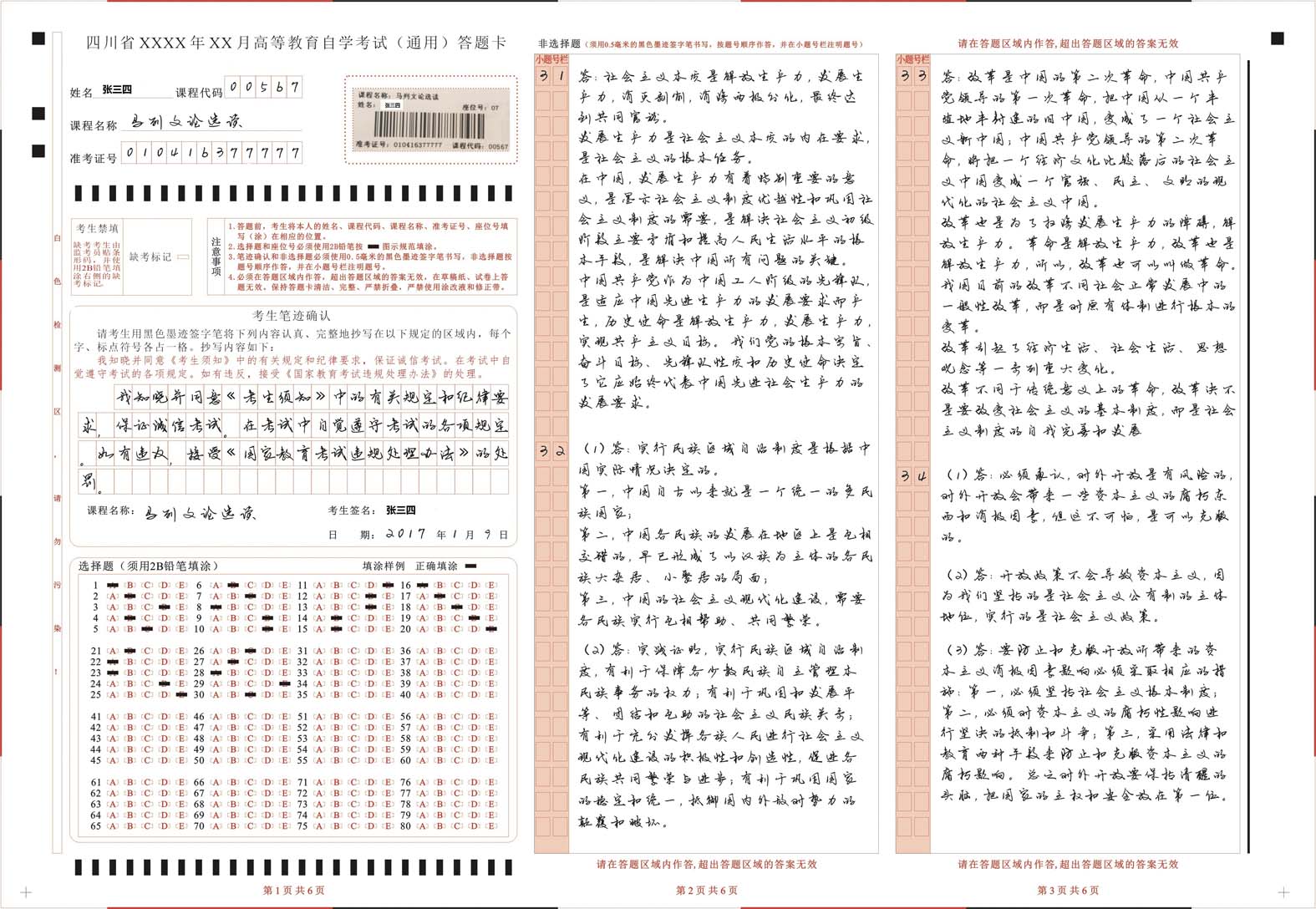 答题卡正面填写姓名、课程代码、课程名称、准考证号,考生笔迹采集区按要求填写,背面填涂座位号;考生禁填的“缺考标记”不能填涂。考生必须在答题卡上的规定区域内作答,超出答题区域的答案无效,在草稿纸、试卷上答题无效。