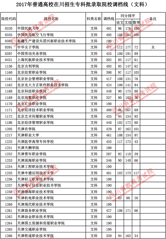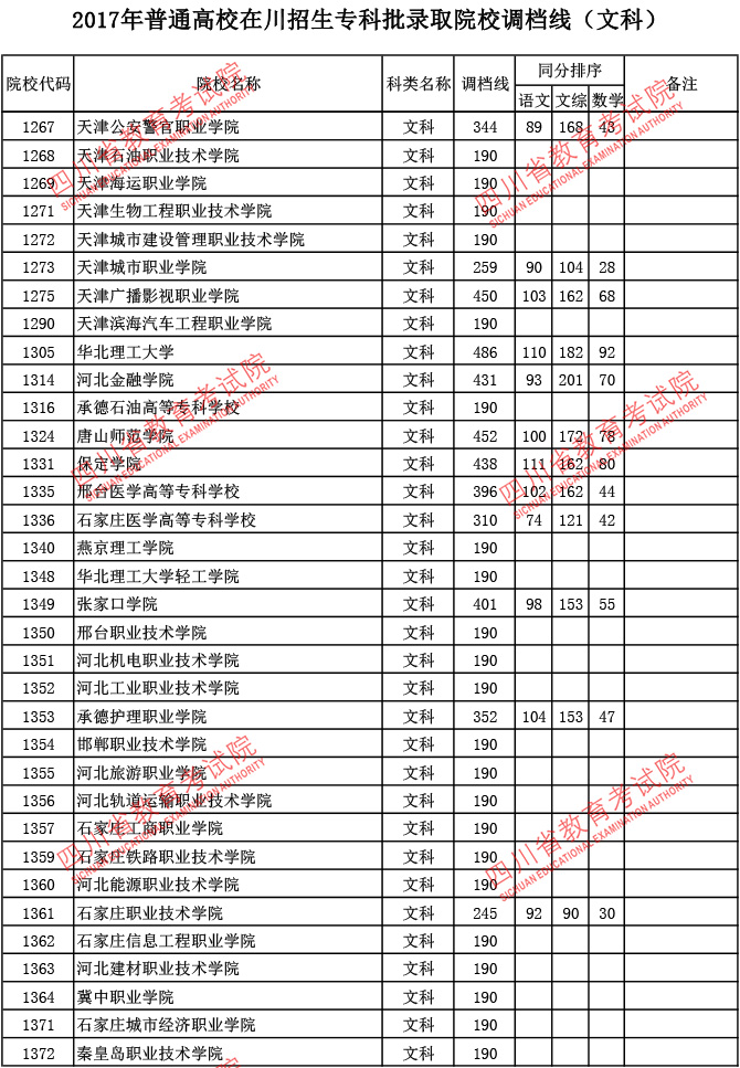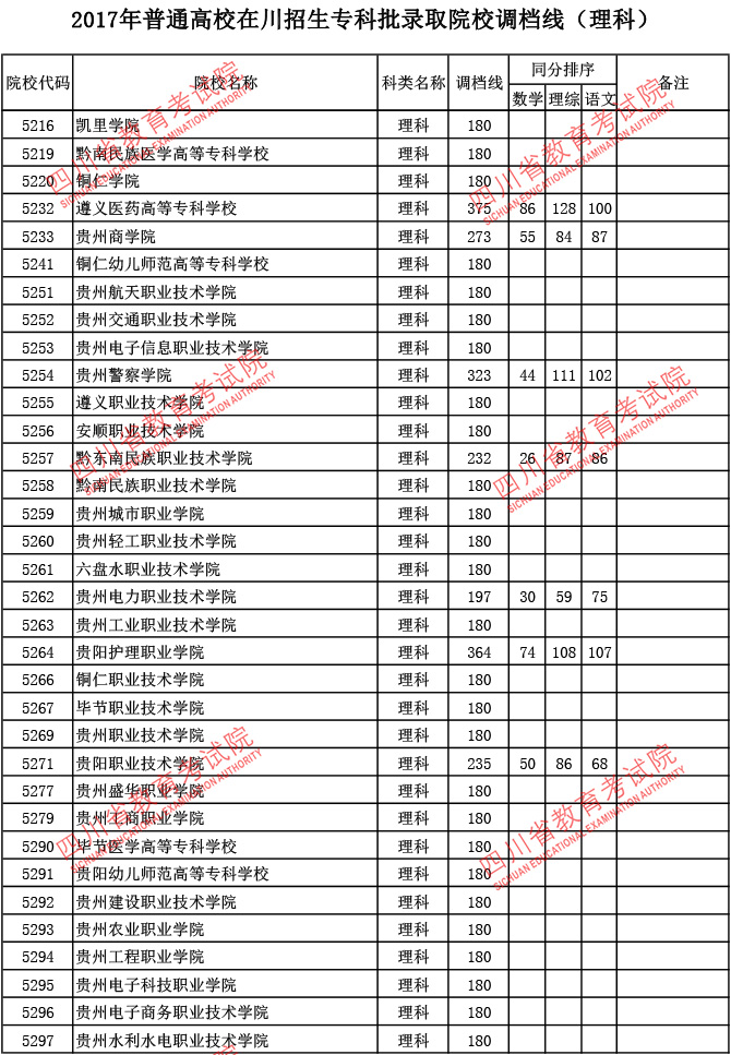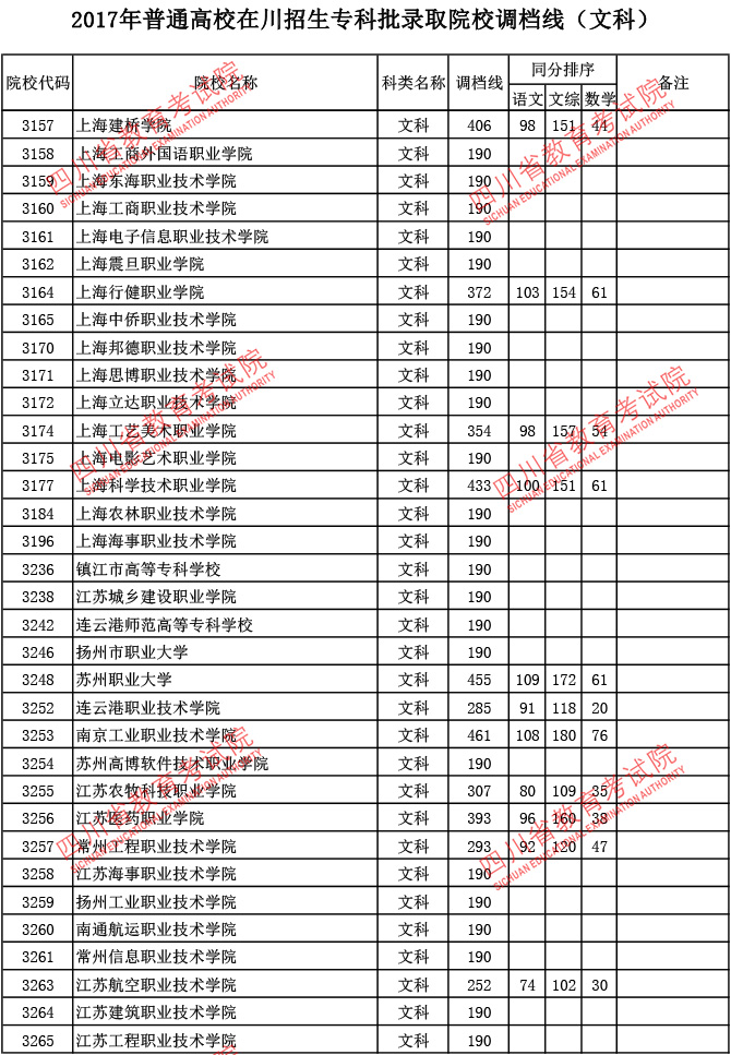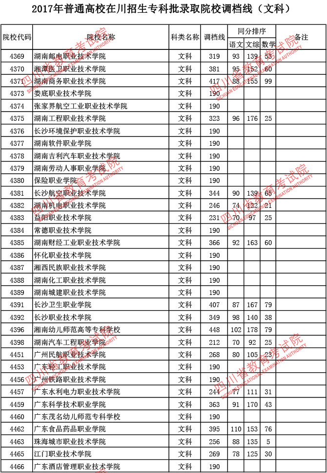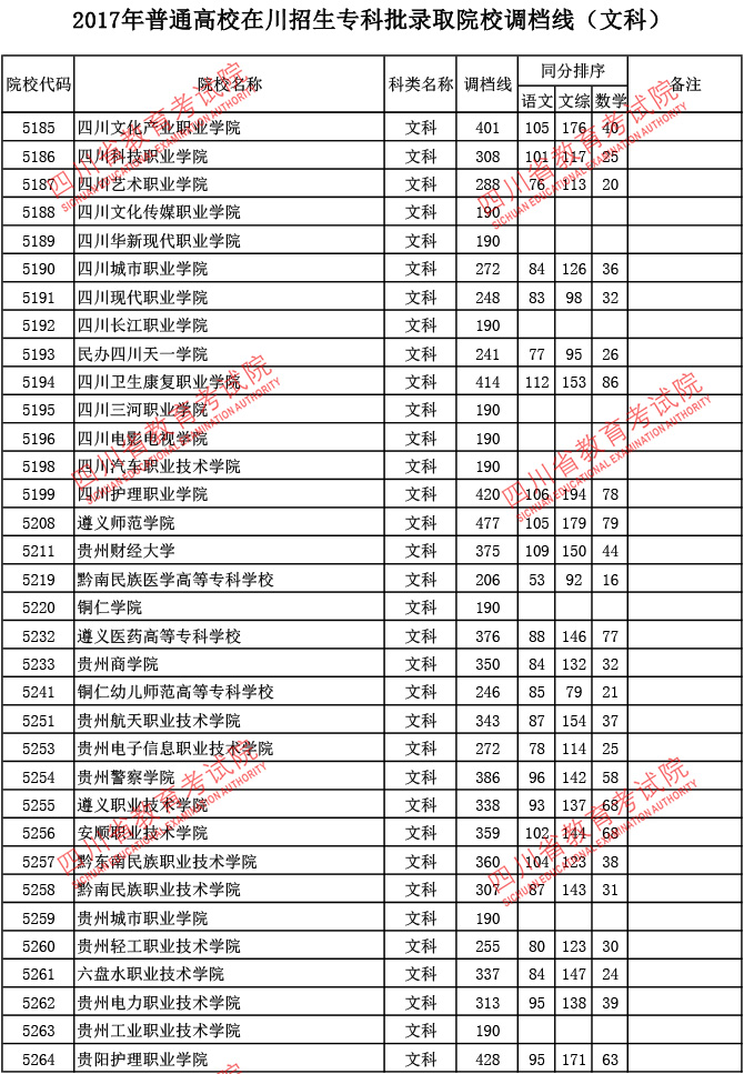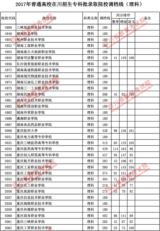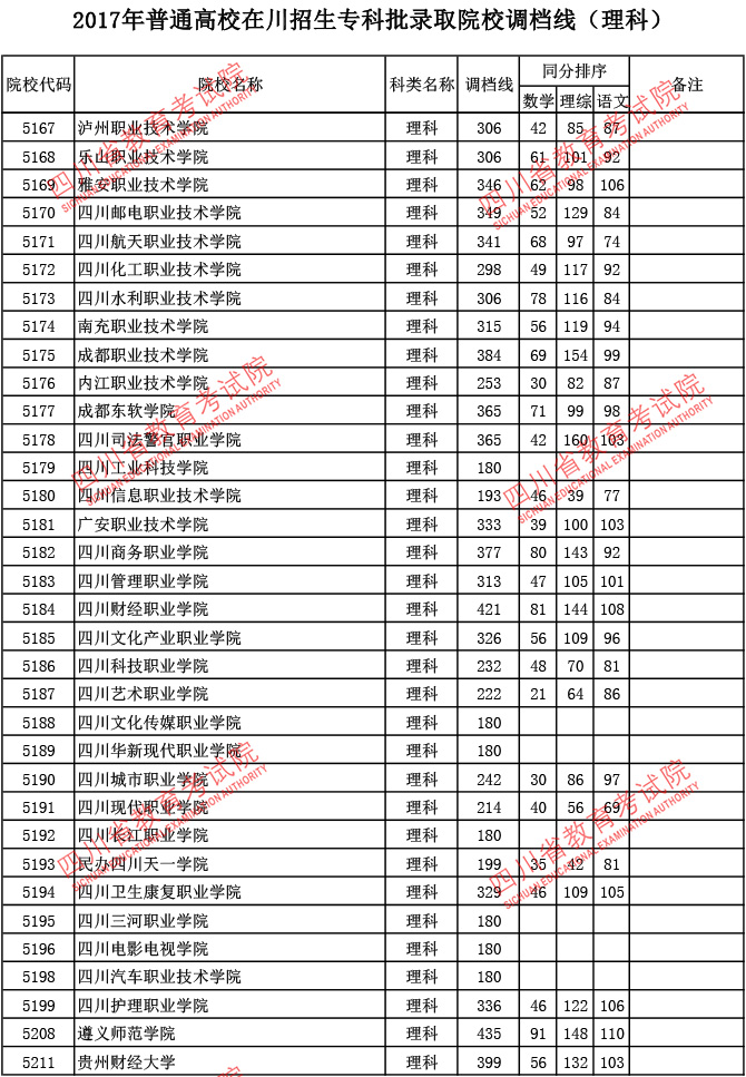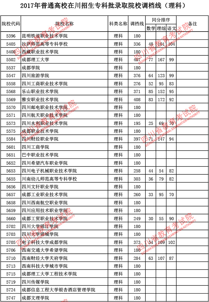 2017年普通高校在川招生专科批录取院校调档线