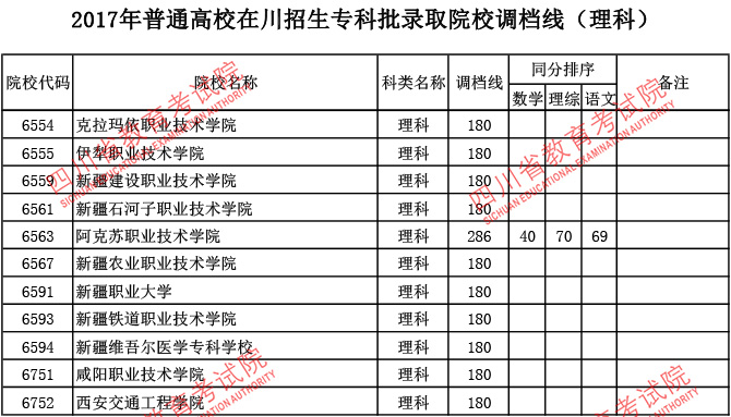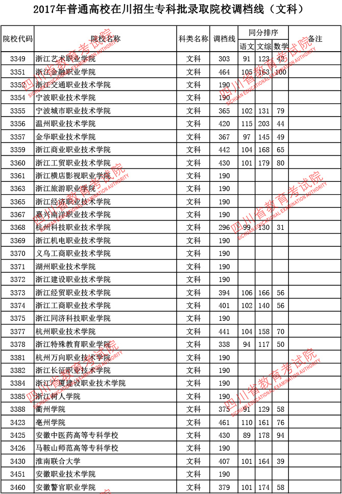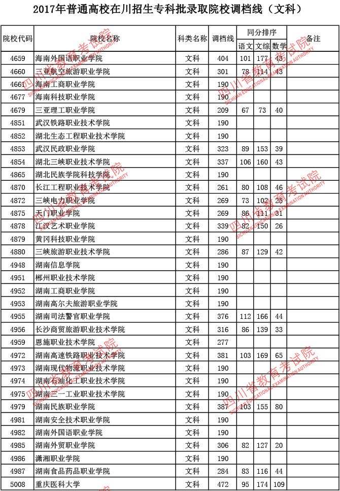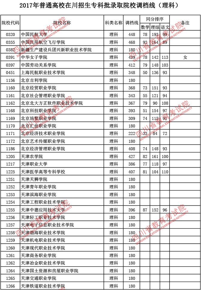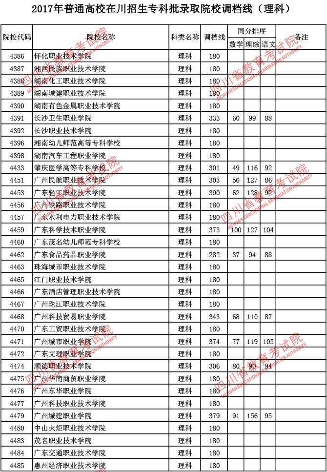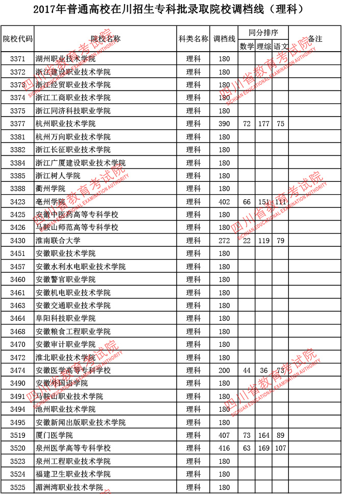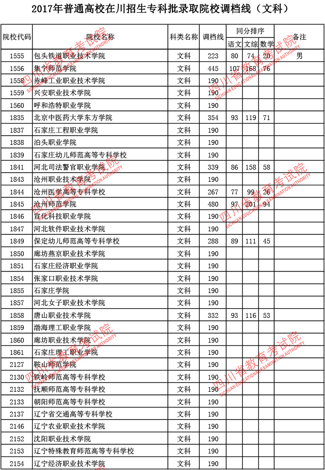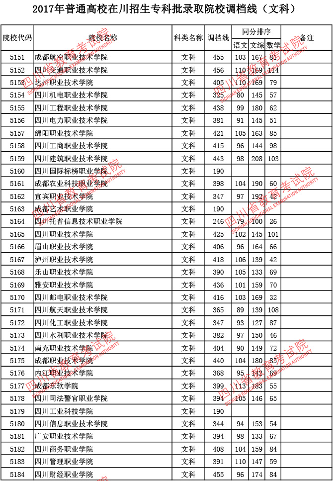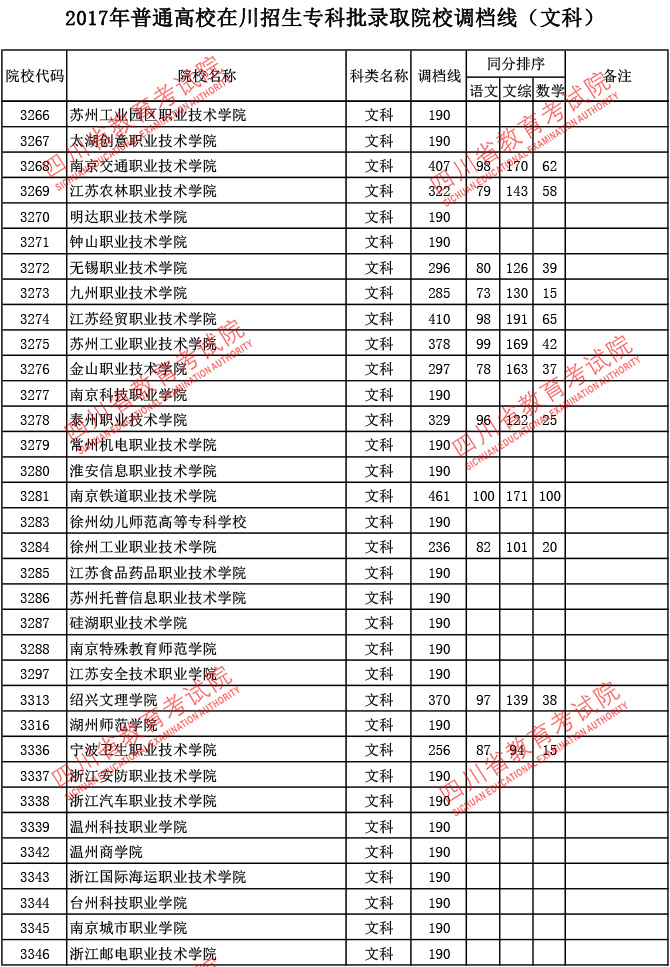2017年普通高校在川招生专科批录取院校调档线