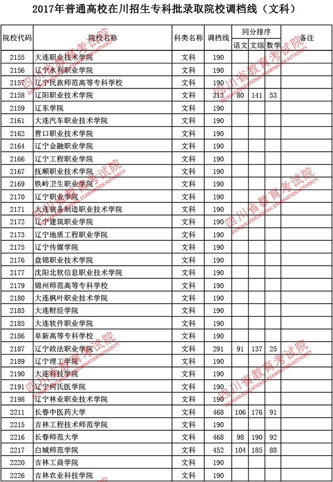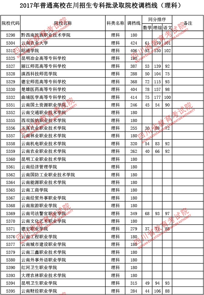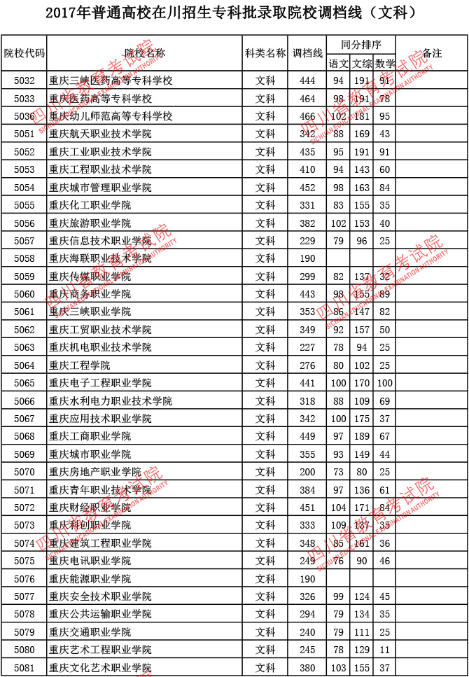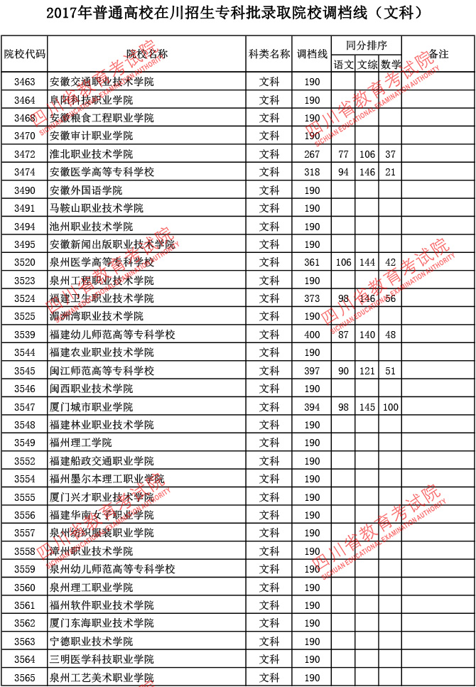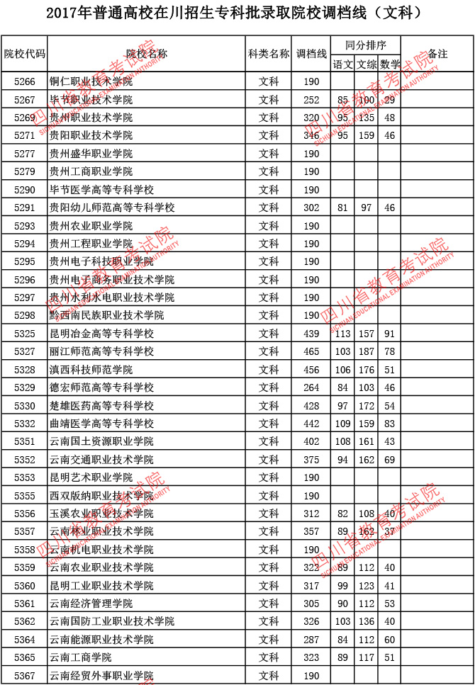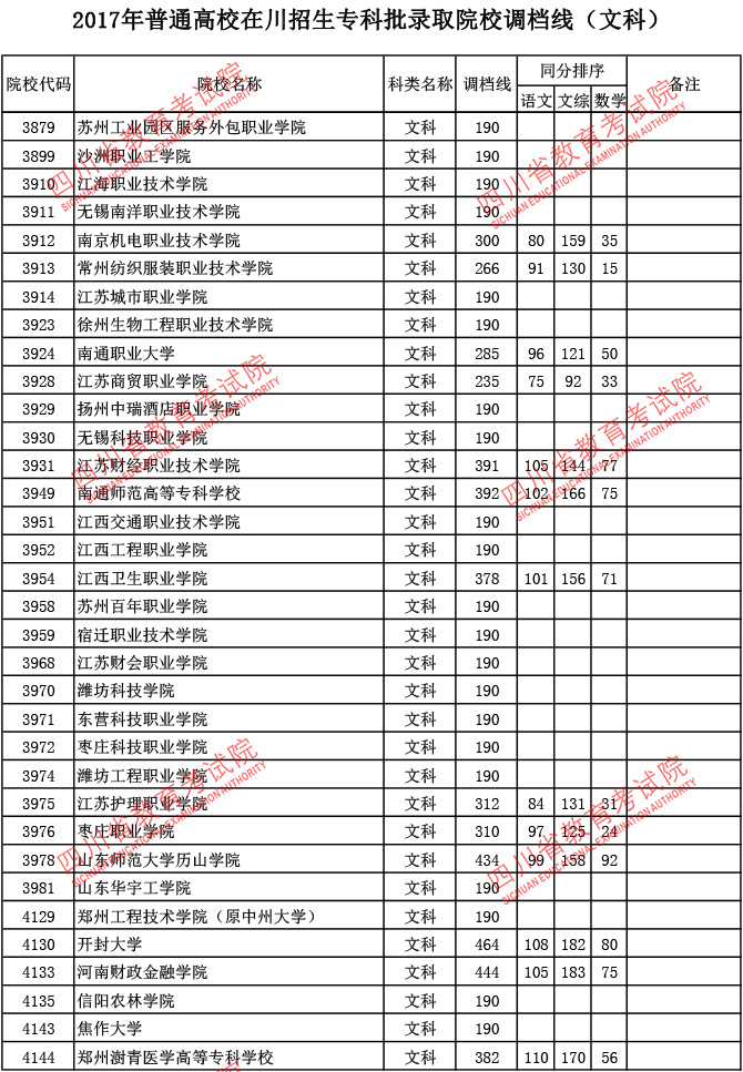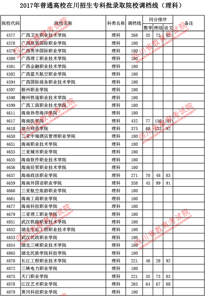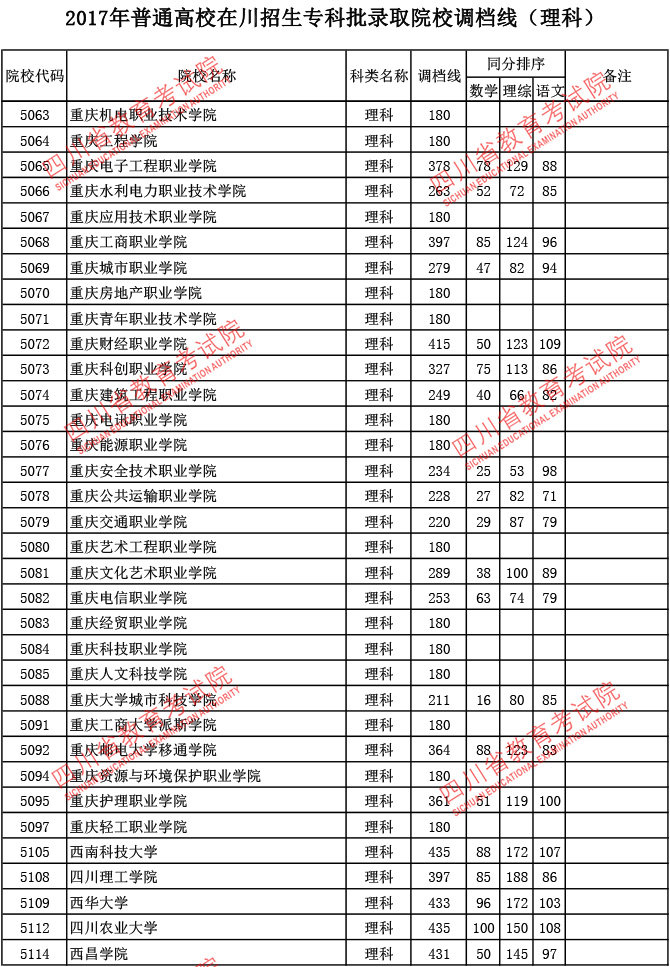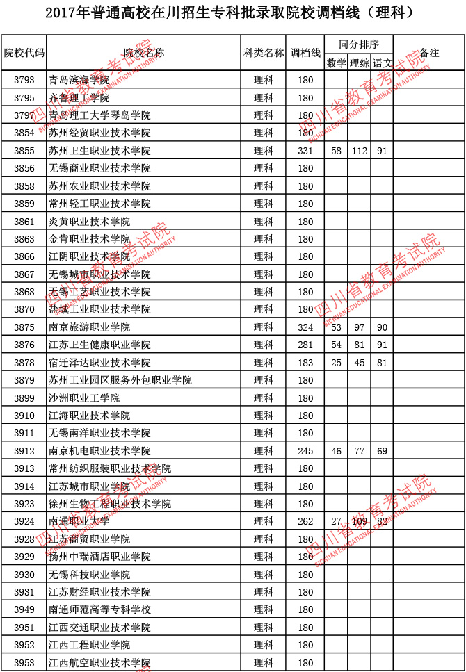 2017年普通高校在川招生专科批录取院校调档线