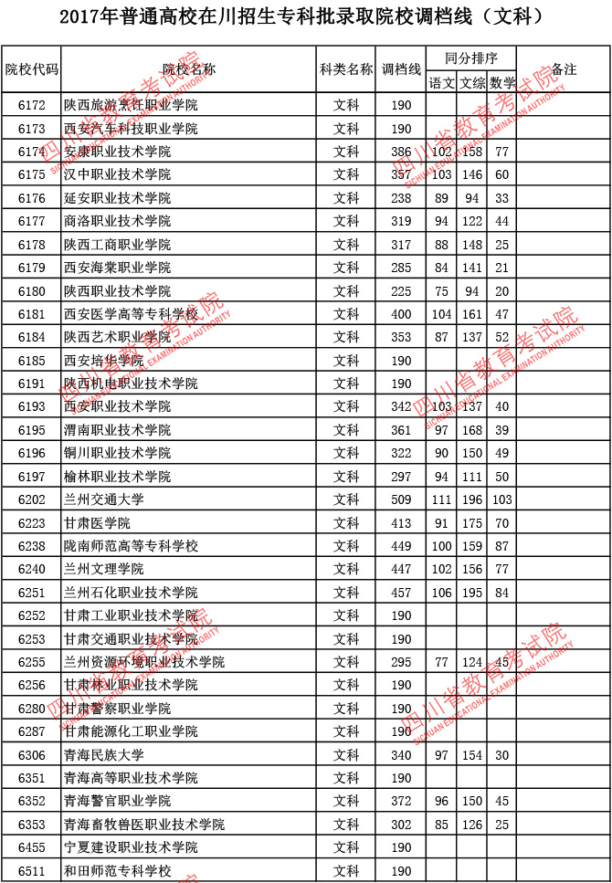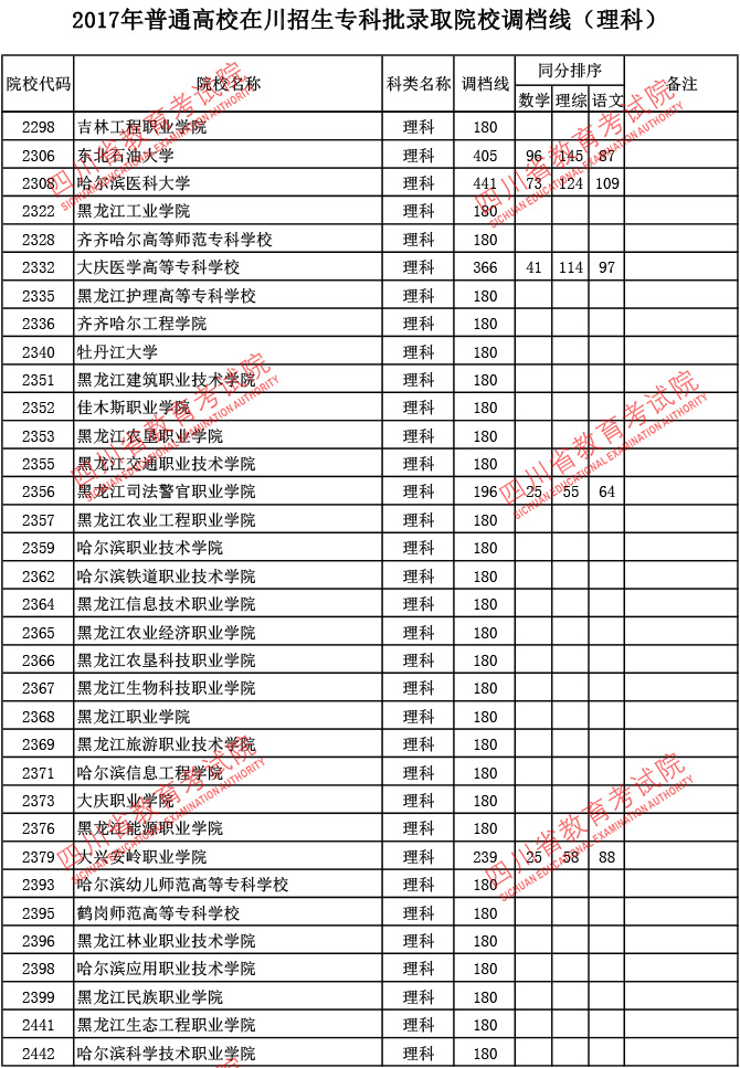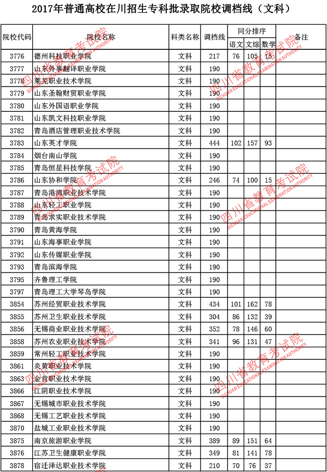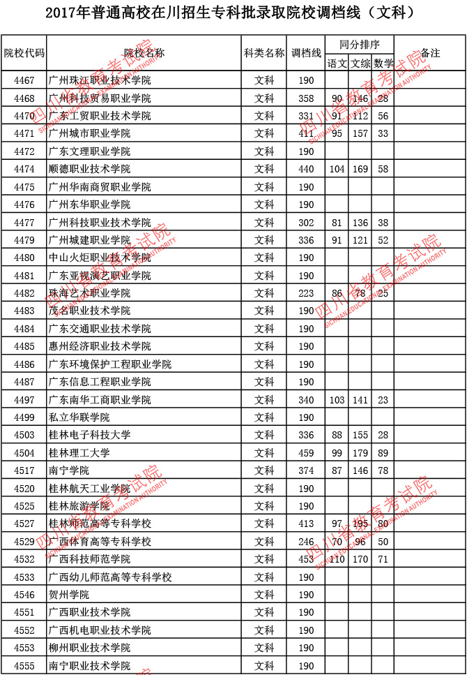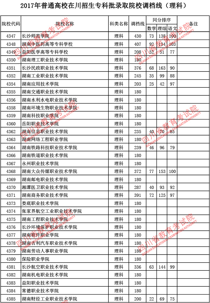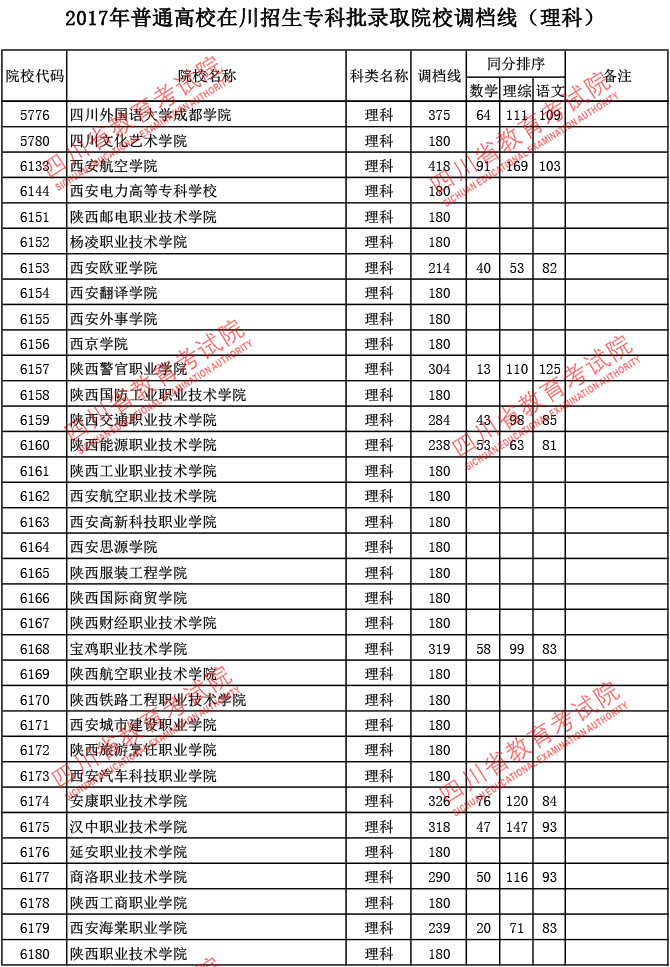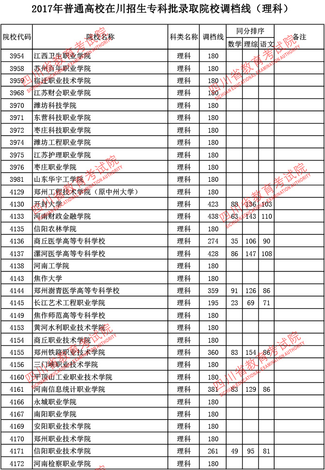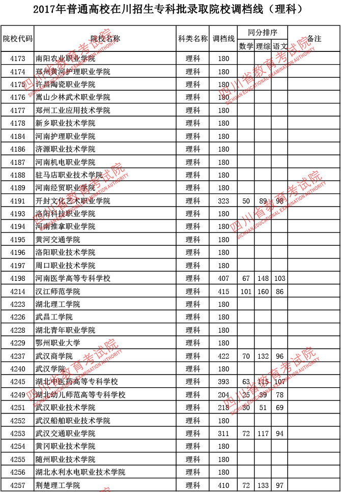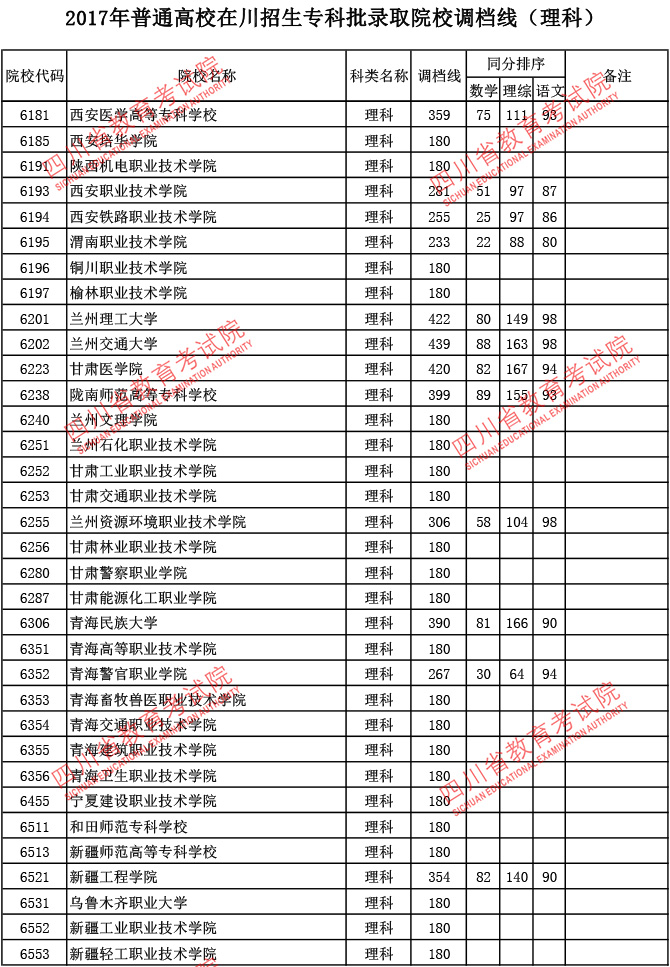 2017年普通高校在川招生专科批录取院校调档线