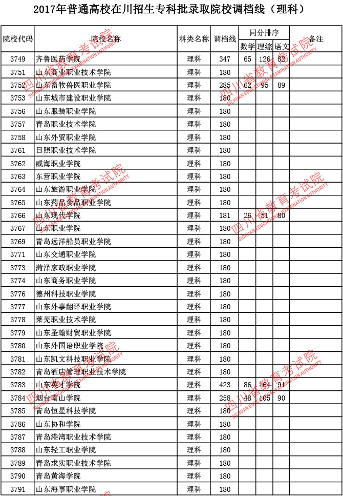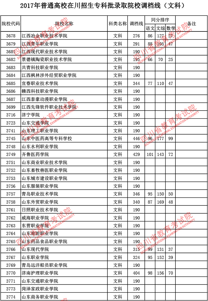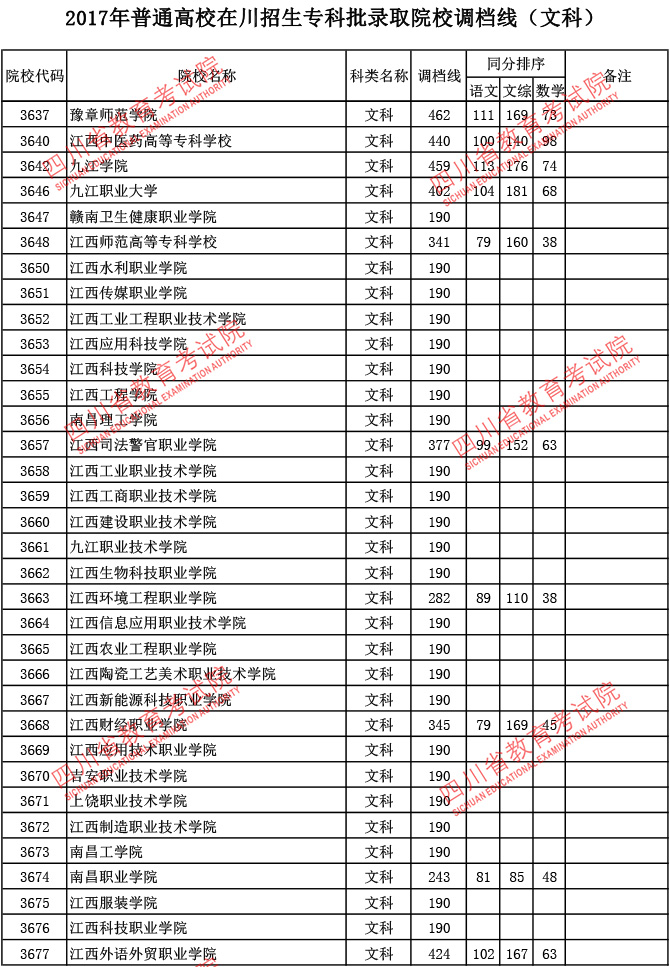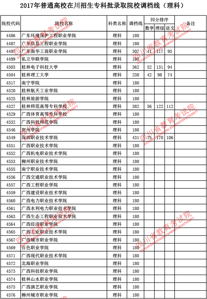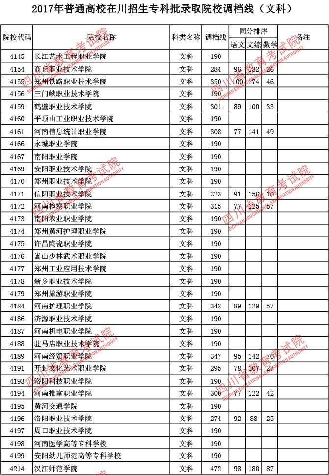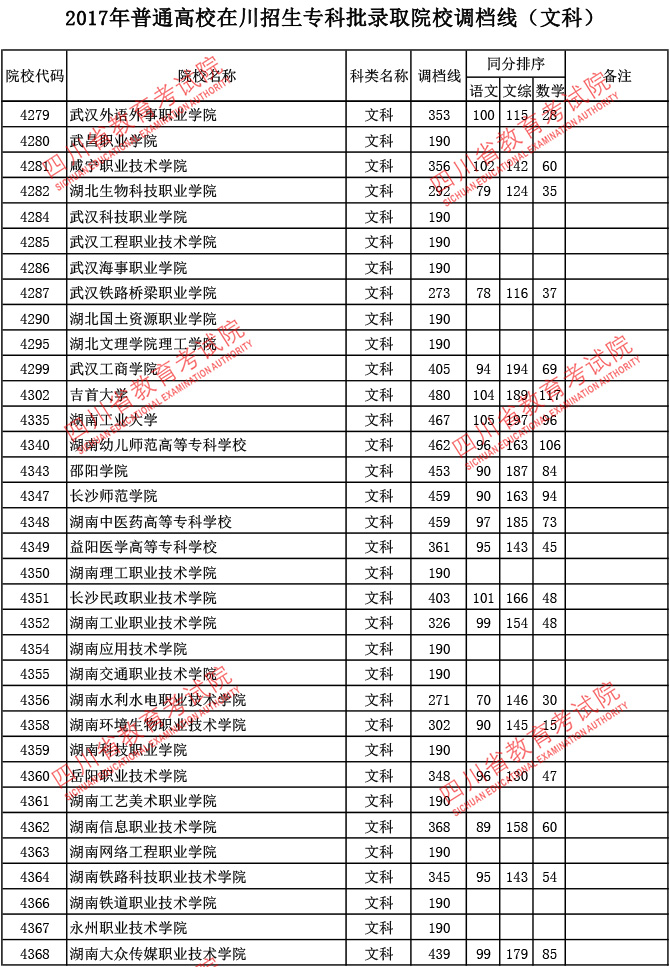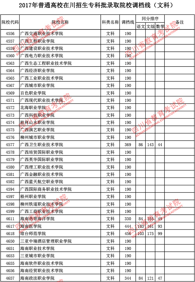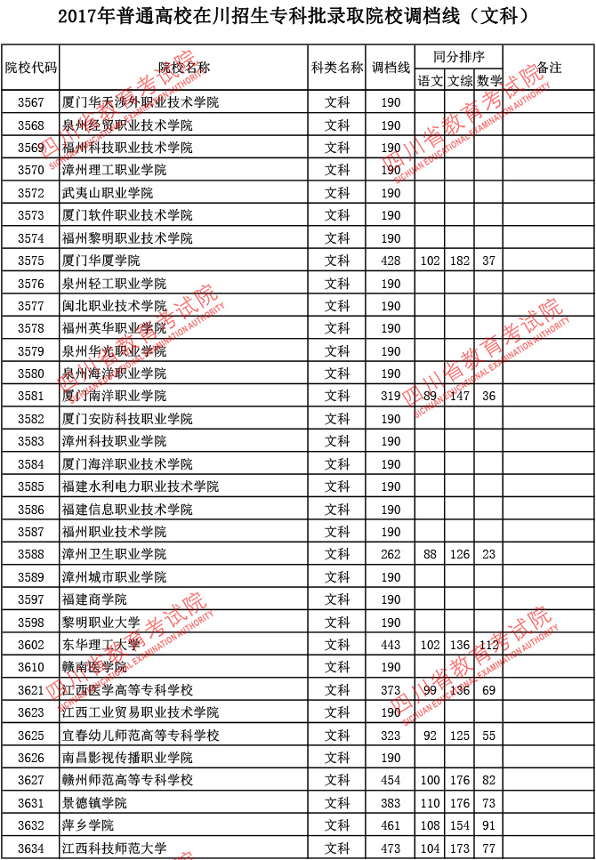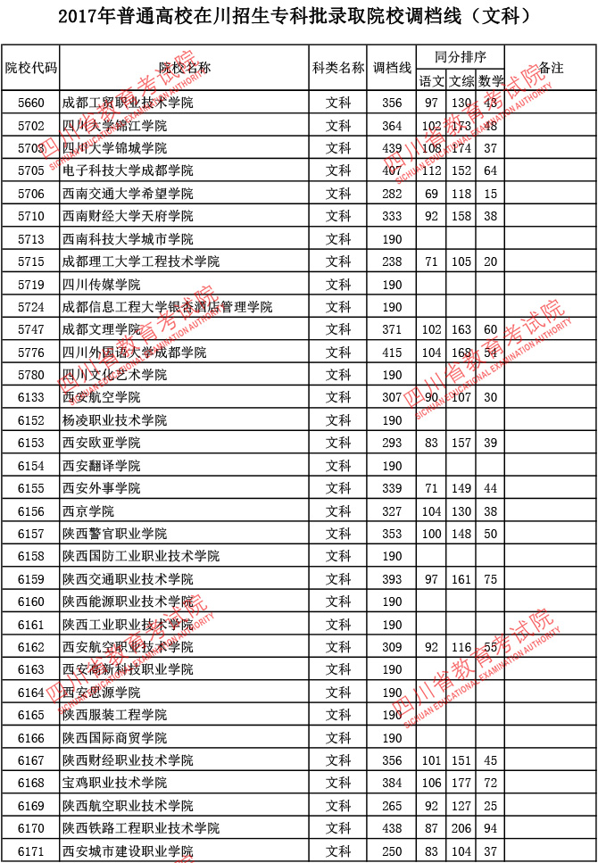 2017年普通高校在川招生专科批录取院校调档线