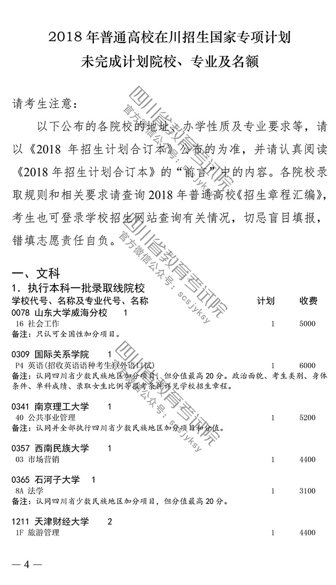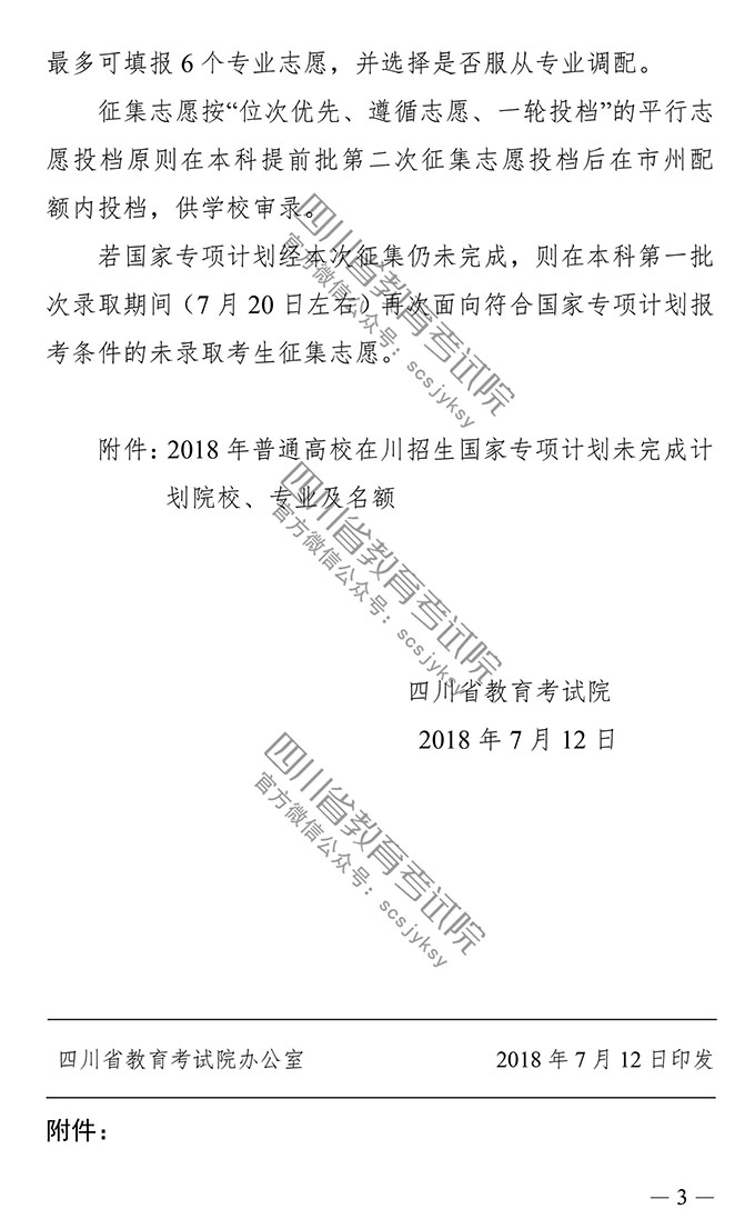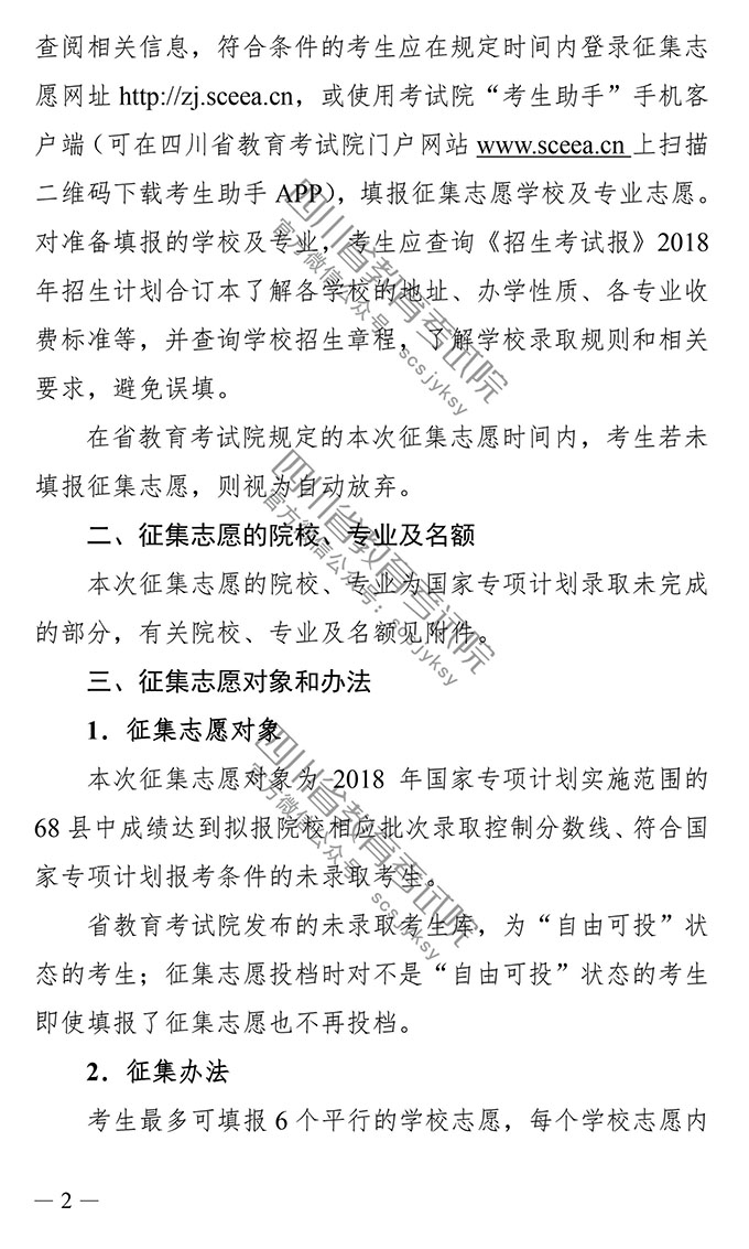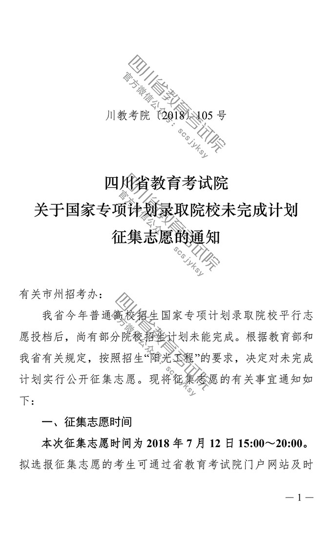 关于国家专项计划录取院校未完成计划征集志愿的通知