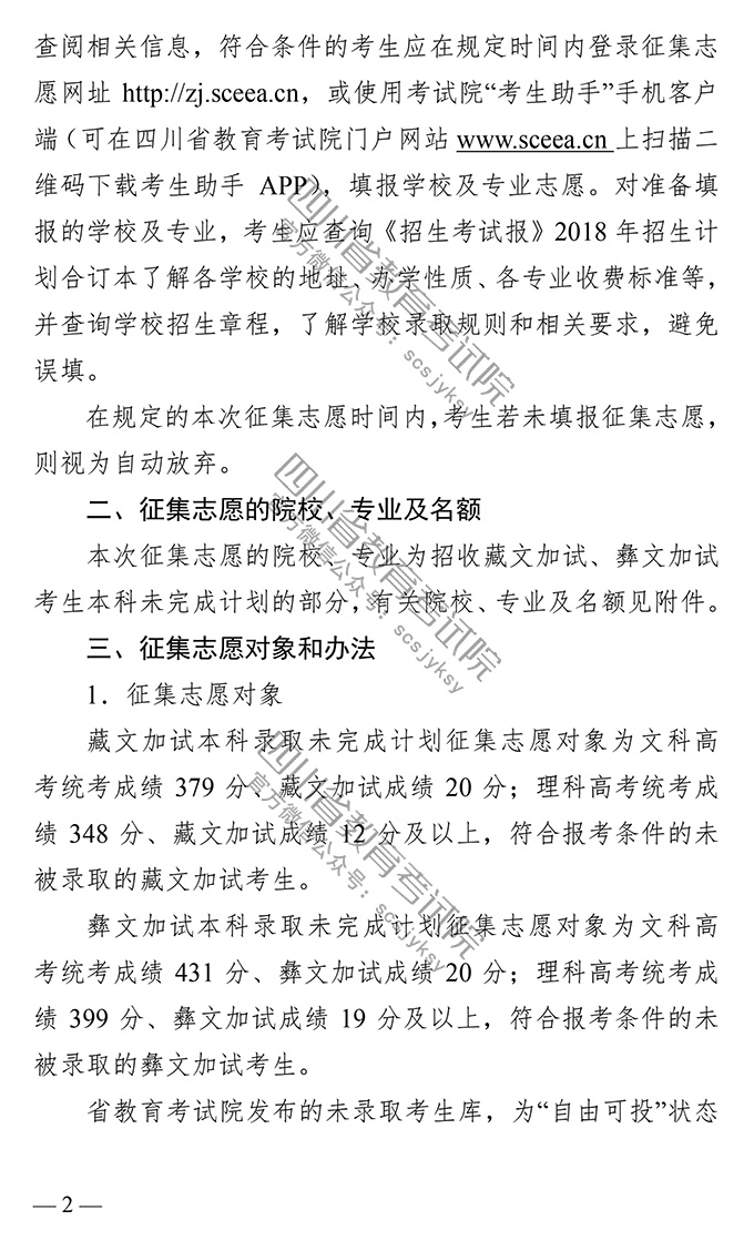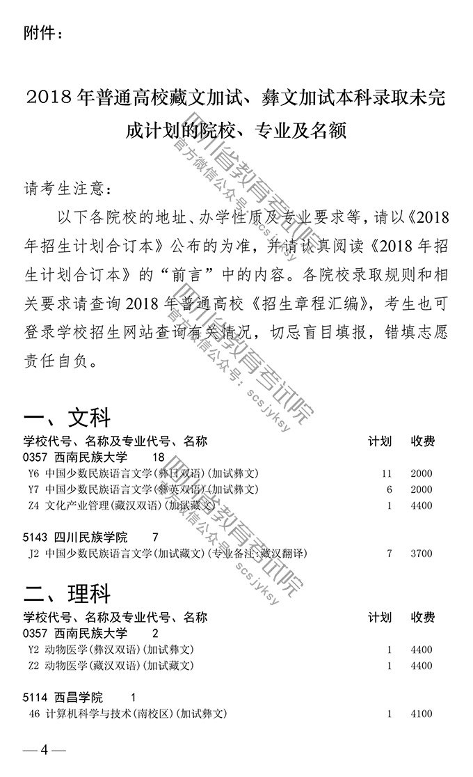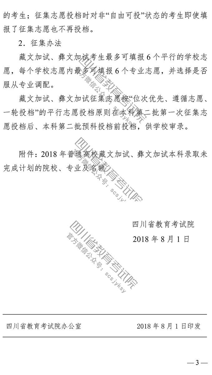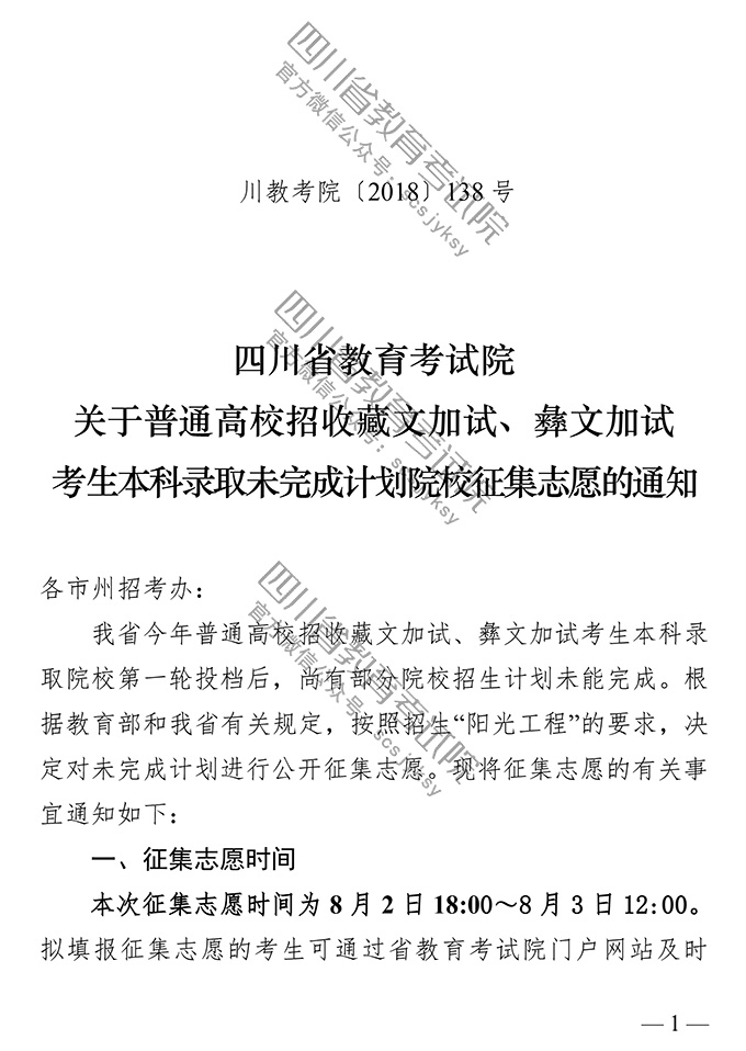 关于普通高校招收藏文加试、彝文加试考生本科录取未完成计划院校征集志愿的通知