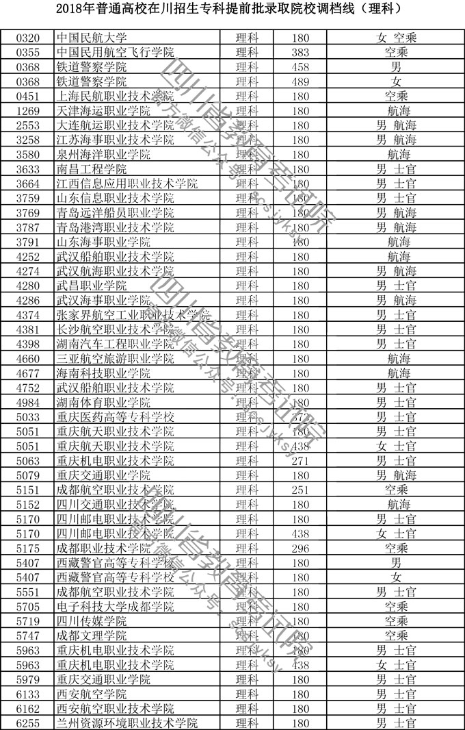 2018年普通高校在川招生专科提前批录取院校调档线