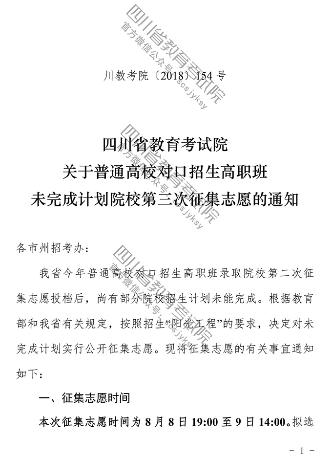 关于普通高校对口招生高职班未完成计划院校第三次征集志愿的通知