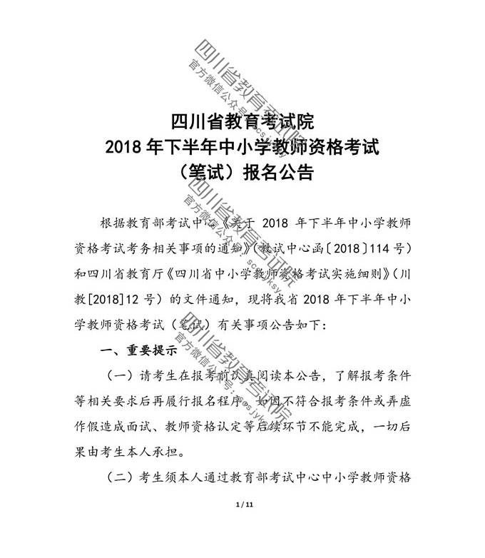 2018年下半年中小学教师资格考试(笔试)报名公告