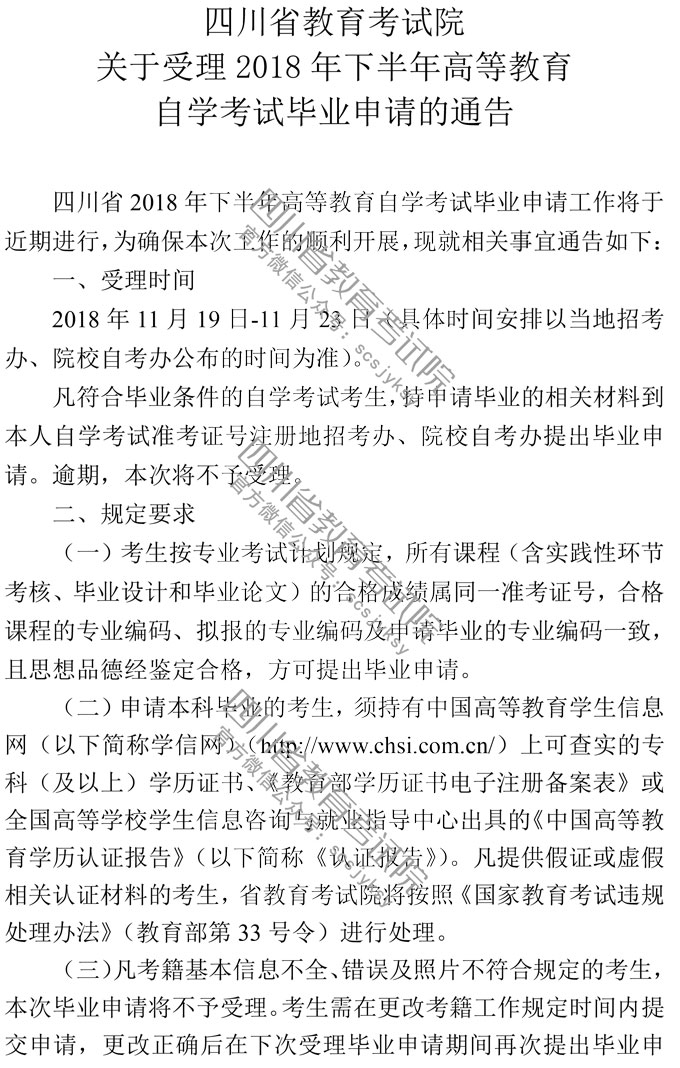 关于受理2018年下半年高等教育自学考试毕业申请的通告