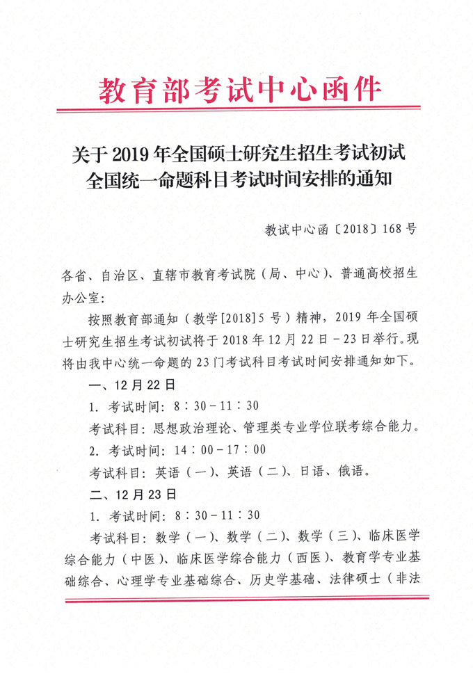 关于2019年全国硕士研究生招生考试初试全国统一命题科目考试时间安排的通知