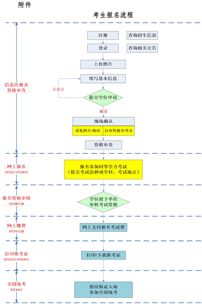 2、申请人通过信息平台申请同等学力全国统考的报名日期为3月4日-3月25日,信息平台网址:http://www.chinadegrees.cn/tdxlsqxt/。