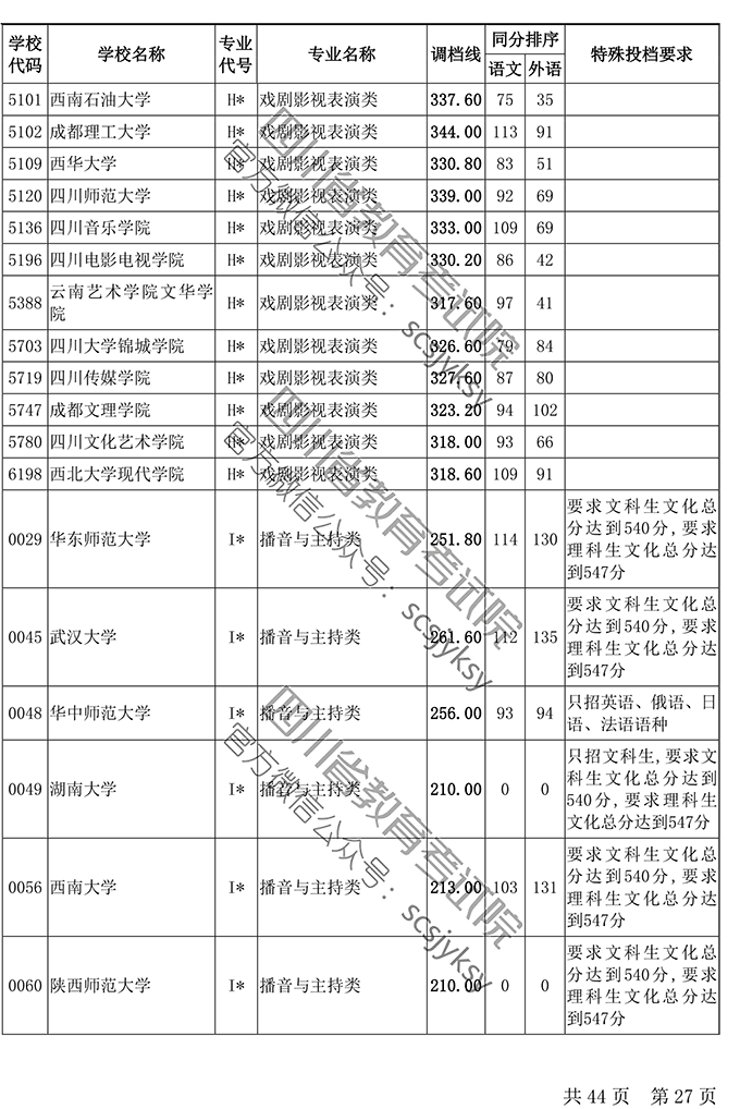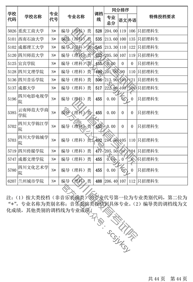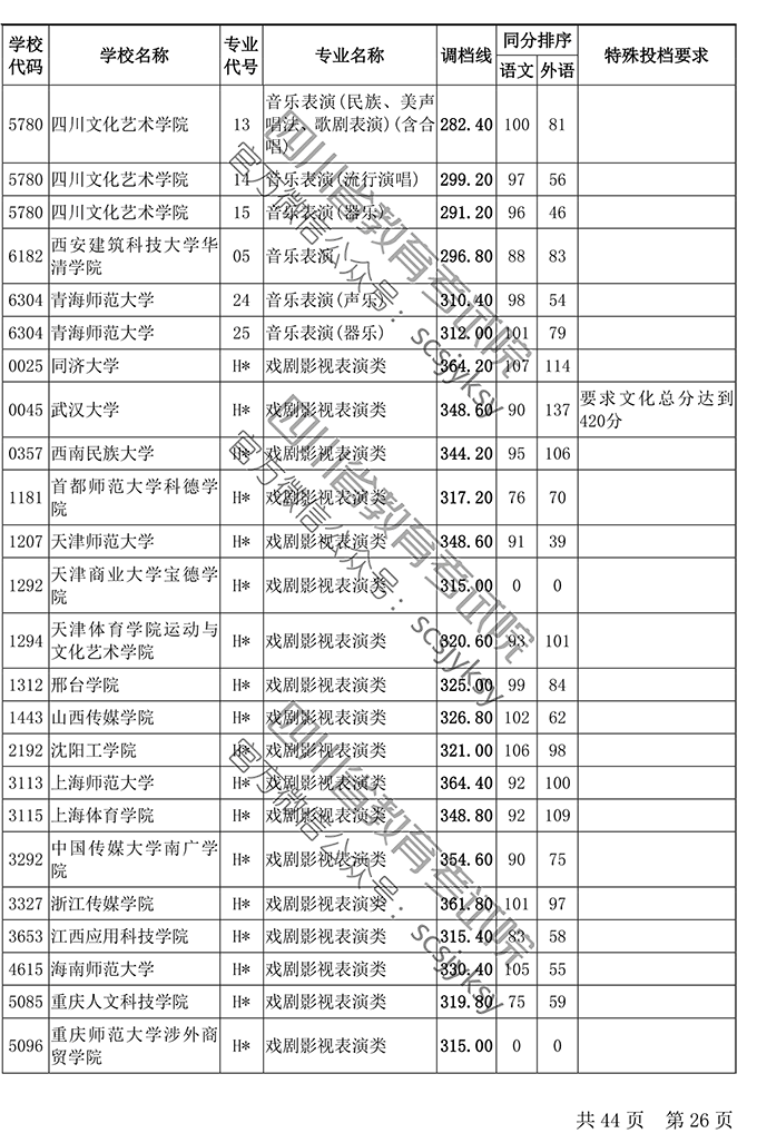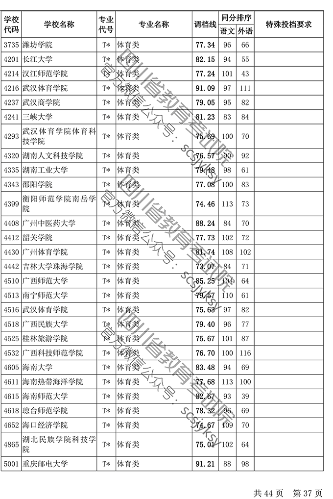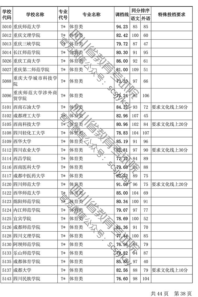 四川省2019年普通高等学校艺术体育类专业招生艺术类本科第一批、体育类本科批调档线