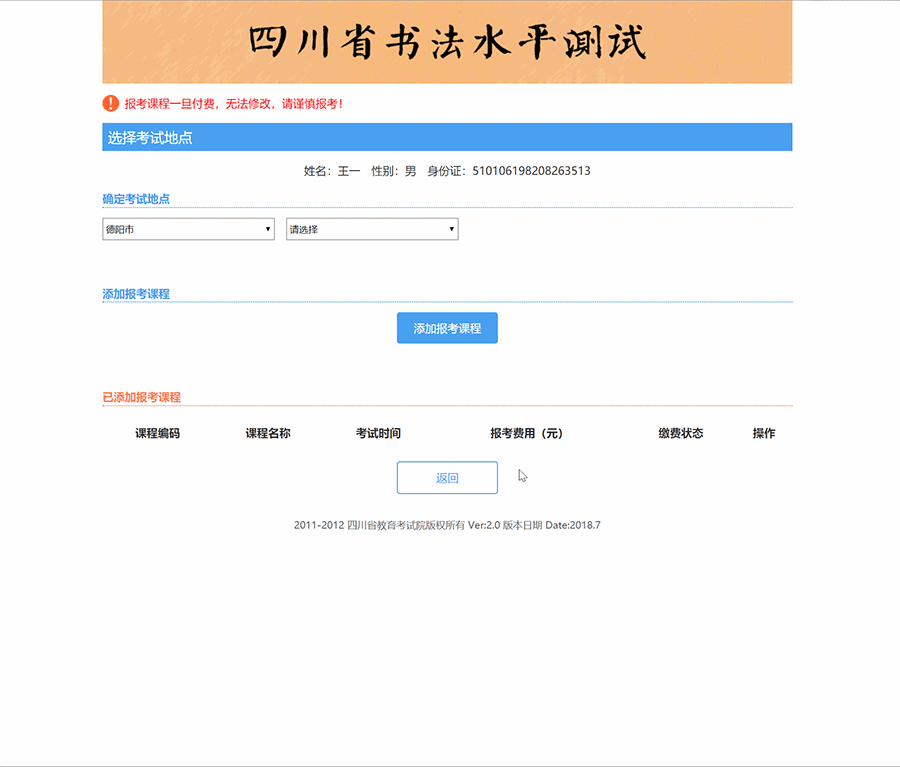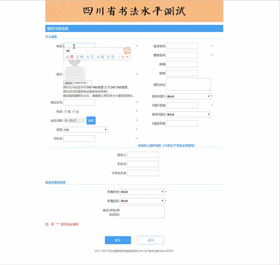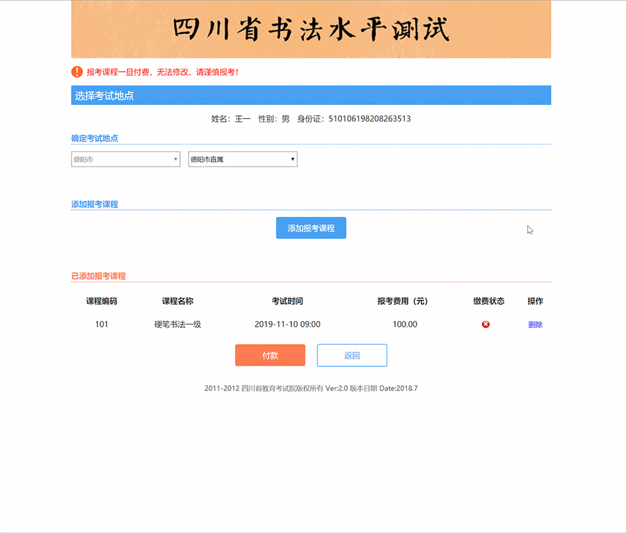 考生按照要求选择报考点、科目(硬笔或毛笔)、等级(1-6)。考生报考有关信息在缴费最终完成之前均可自行修改。