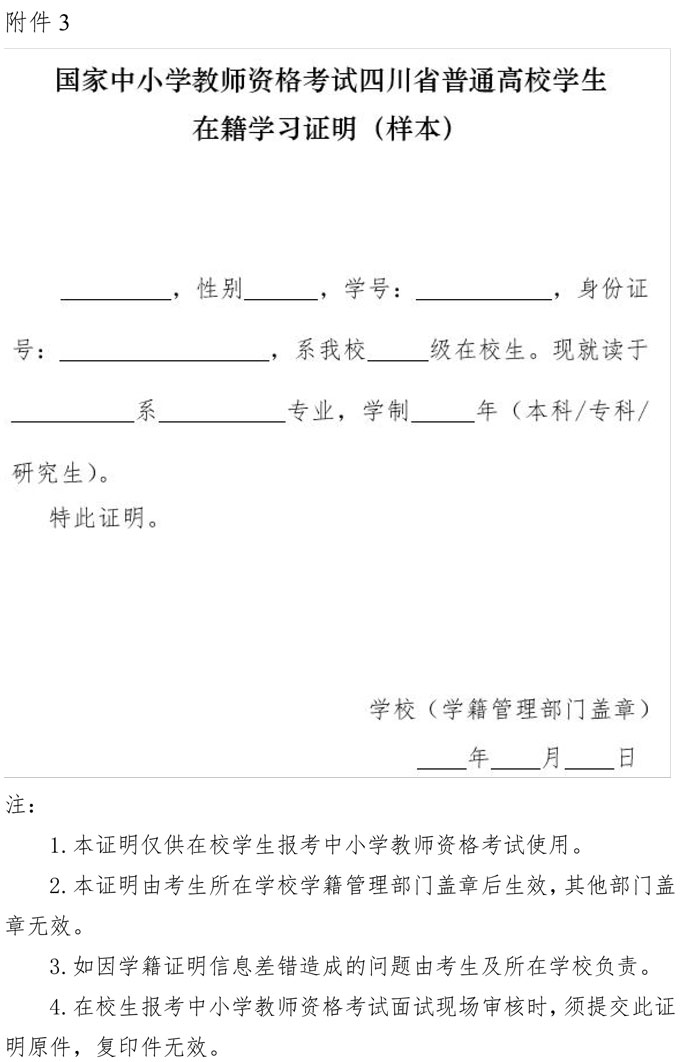 (七)四川省内高等学校在校毕业前两年内的学生(含在校研究生)以及符合经四川省教育厅审定合格的中等职业学校学前教育专业(附件1)在校毕业前两年内的学生,可凭学校出具的在籍学习证明在学校所在地报名参加考试。四川户籍的外省在校生须在就读学校所在地报名参加考试。