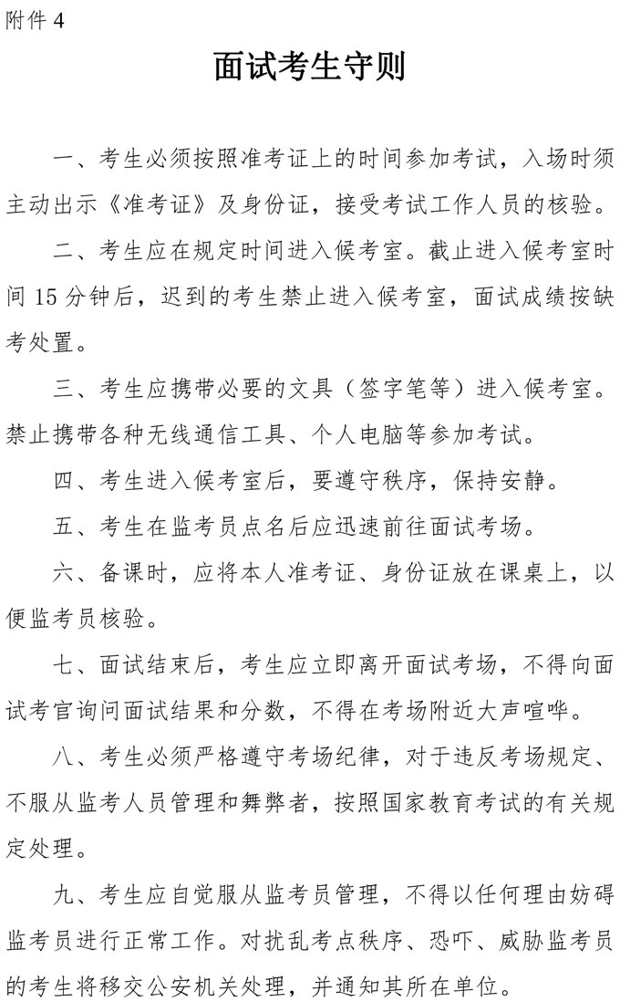 (五)中职文化课教师资格考试的面试科目与高级中学教师资格考试面试科目相同,中职专业课、中职实习指导教师资格考试的面试科目根据考生的专业选报相应的科目(注意:报考中职专业课、中职实习指导教师资格的考生面试时需自带所报考科目的专业课教材)。