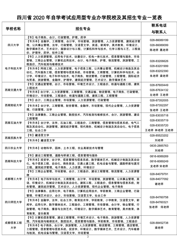 自学考试是我国高等教育的重要组成部分,是个人自学、社会助学和国家考试相结合的高等教育形式。为促进自学考试持续健康发展,省招考委、省教育厅同意四川大学等55所高等学校为我省2020年高等教育自学考试应用型专业的主考学校,并开展自学考试助学工作,现将有关高等学校、主考专业及相关情况公告如下: