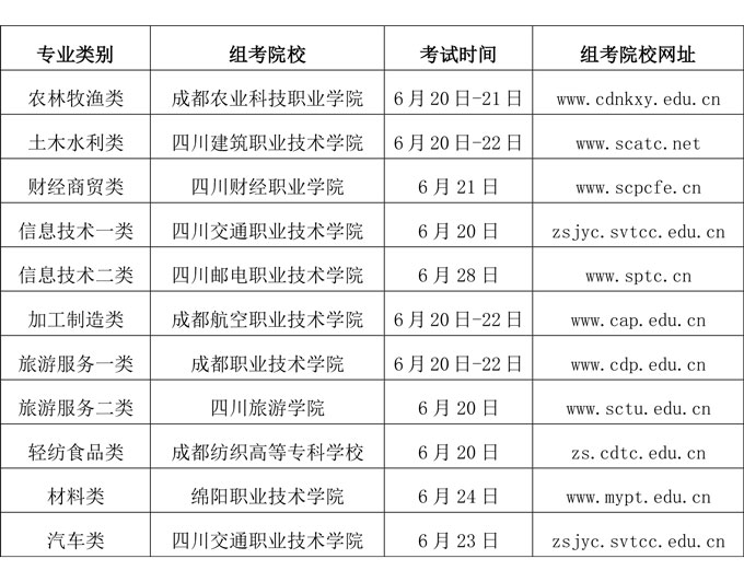 2.技能统考由组考院校组织进行。技能统考的专业类别、组考院校及考试时间如下: