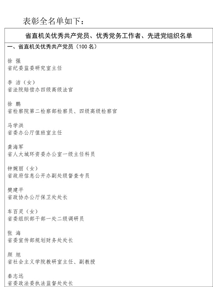 会上,100名优秀共产党员、50名优秀党务工作者、100个先进党组织受到表彰,150名青年学习标兵和50个青年学习标兵(集体)受到表扬,6个先进集体和个人代表作了交流发言。省教育考试院党委荣获省直机关“先进党组织”表彰,研究生招生处(成人高校招生处)乔木荣获省直机关“青年学习标兵”表扬。