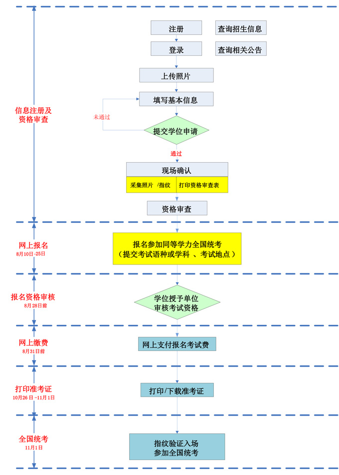 2.申请人通过信息平台申请同等学力全国统考的报名日期为8月10日-8月25日,信息平台网址:http://www.chinadegrees.cn/tdxlsqxt/。