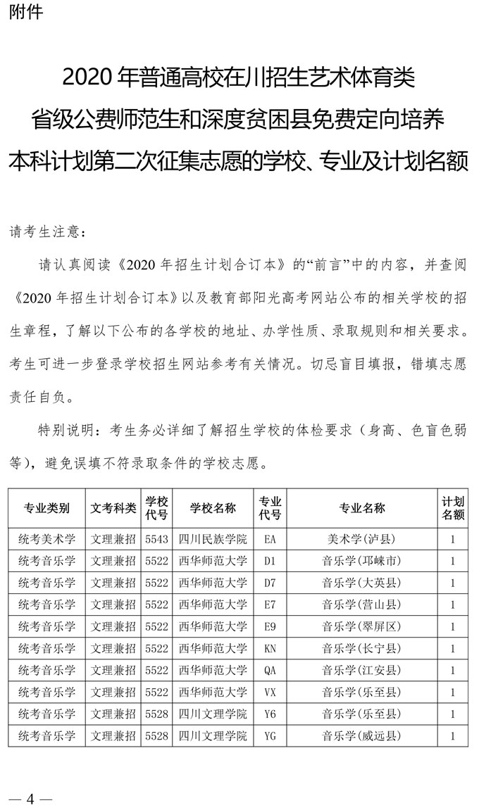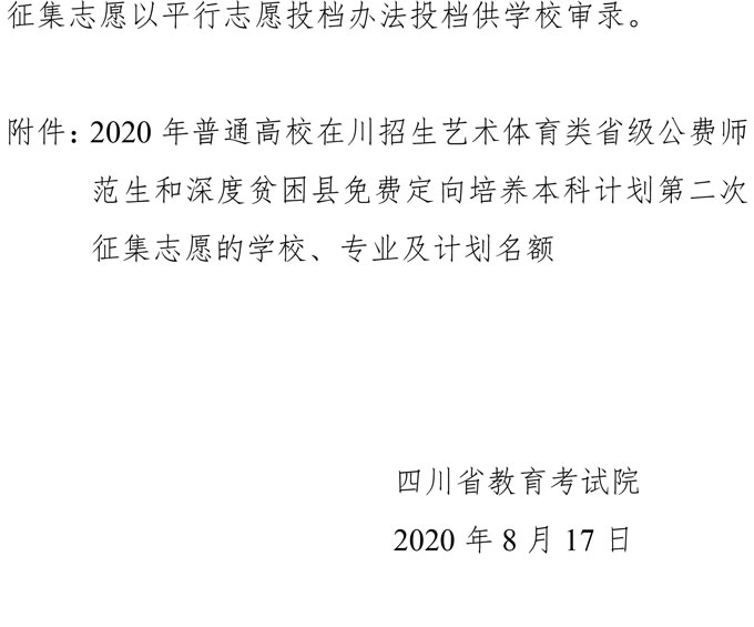 关于四川省2020年普通高校艺术体育类省级公费师范生和深度贫困县免费定向培养本科录取未完成计划学校第二次征集志愿的通知
