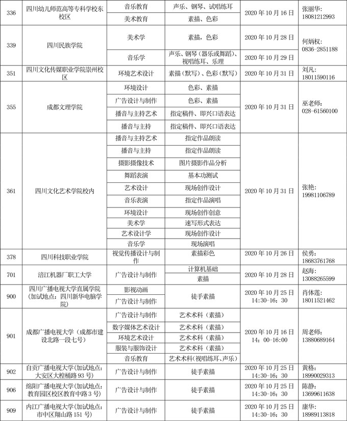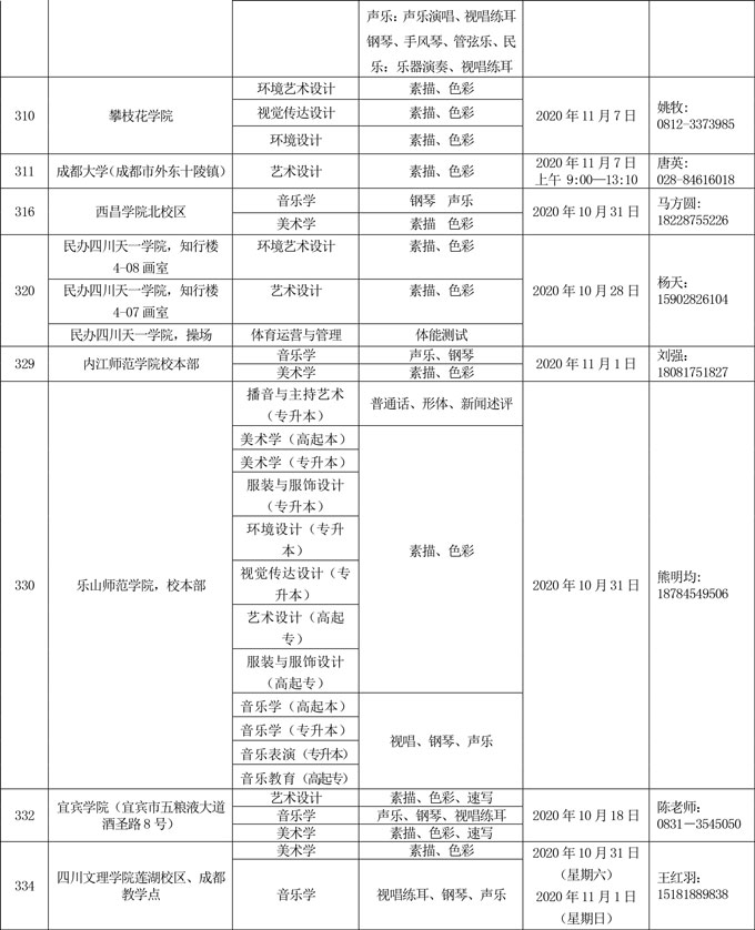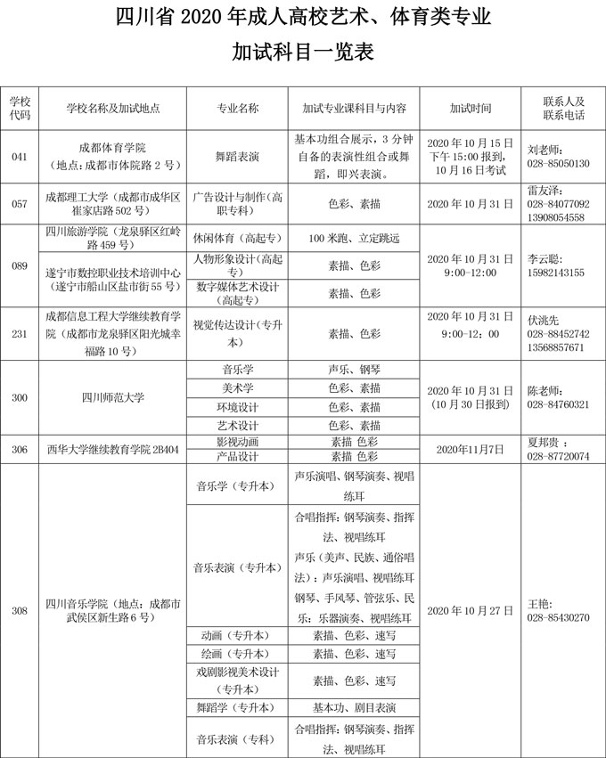 四川省2020年成人高校艺术、体育类专业加试科目一览表