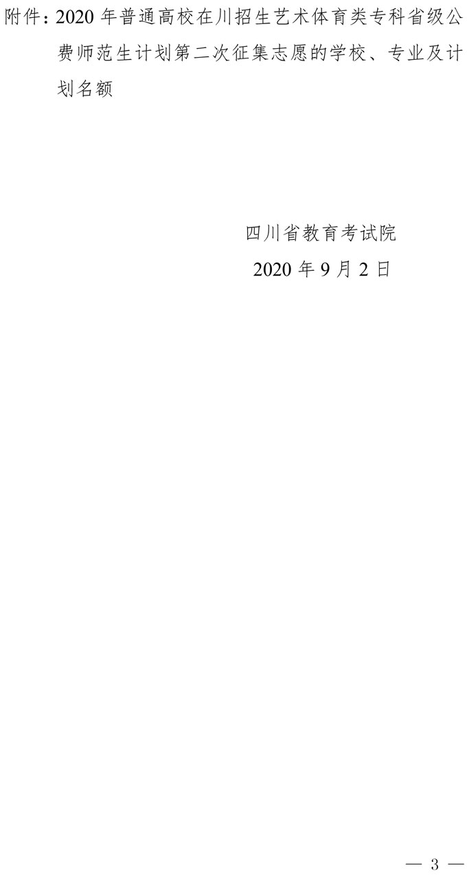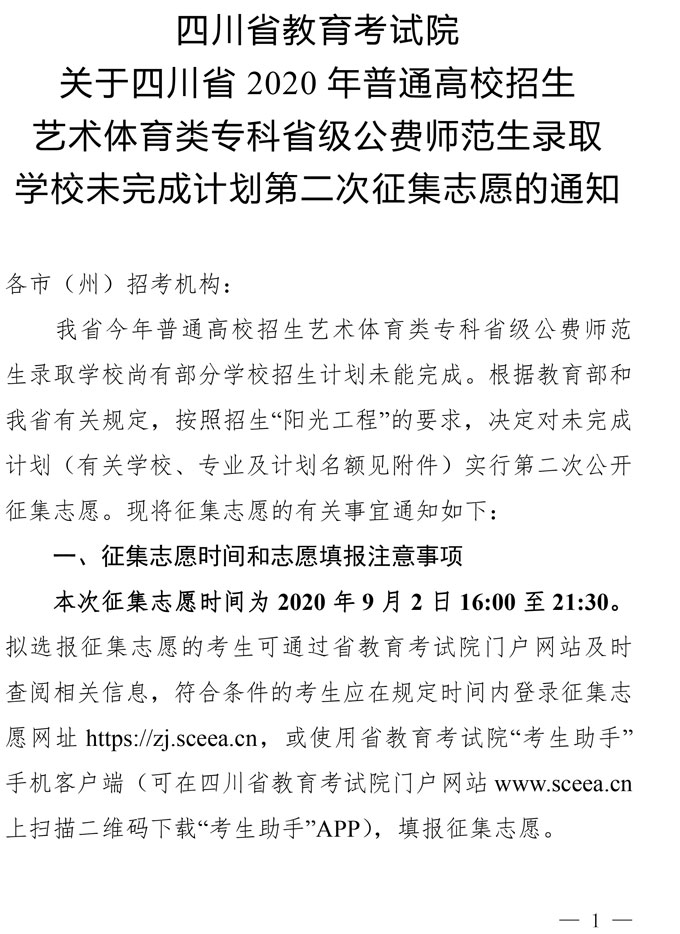 关于四川省2020年普通高校招生艺术体育类专科省级公费师范生录取学校未完成计划第二次征集志愿的通知