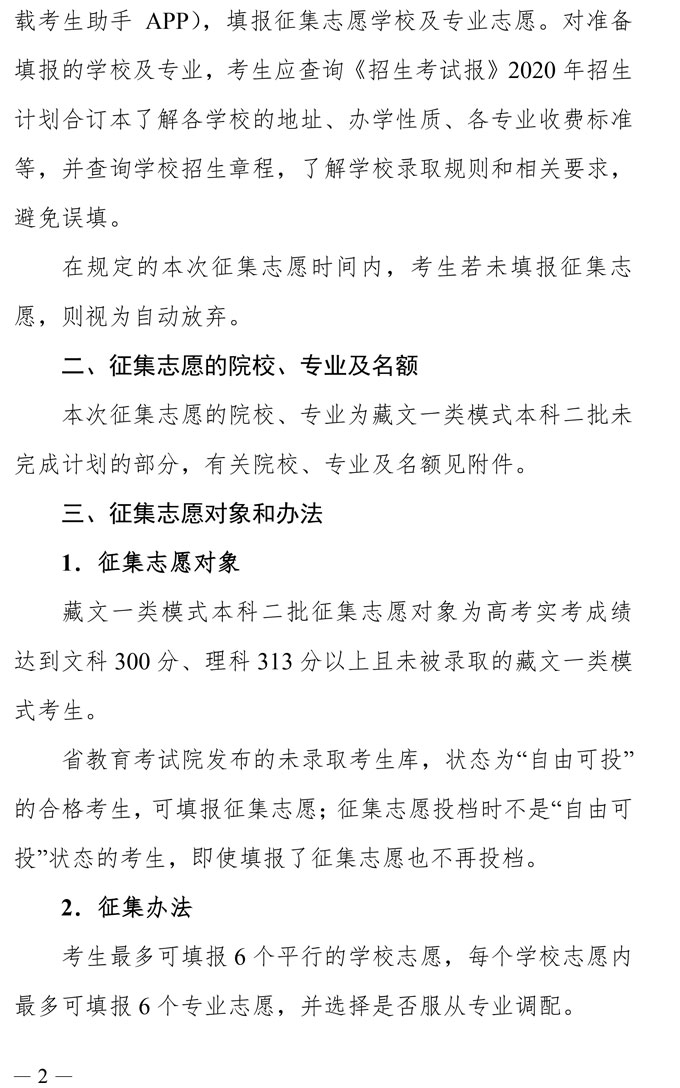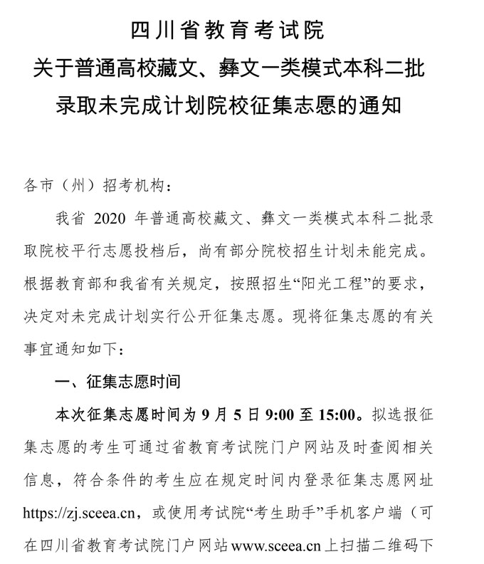 关于普通高校藏文、彝文一类模式本科二批录取未完成计划院校征集志愿的通知