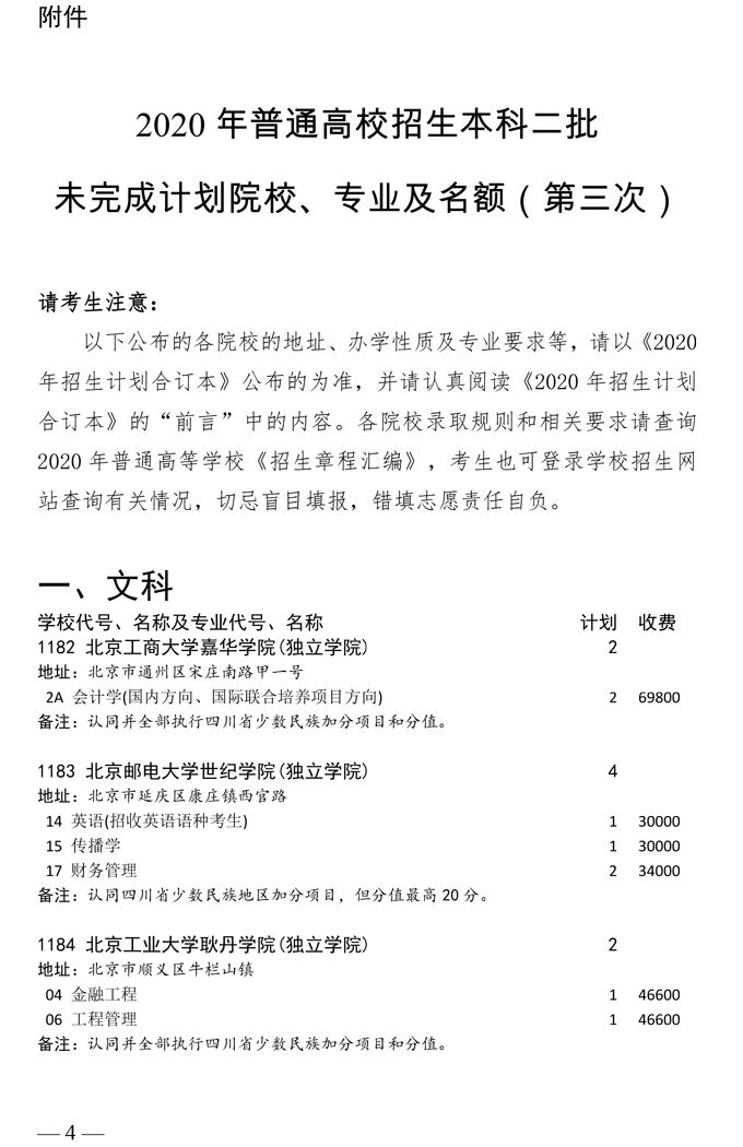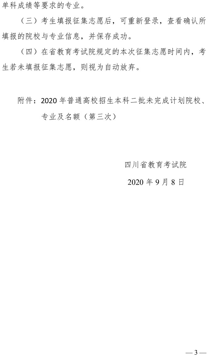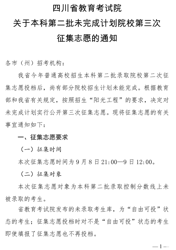 关于本科第二批未完成计划院校第三次征集志愿的通知
