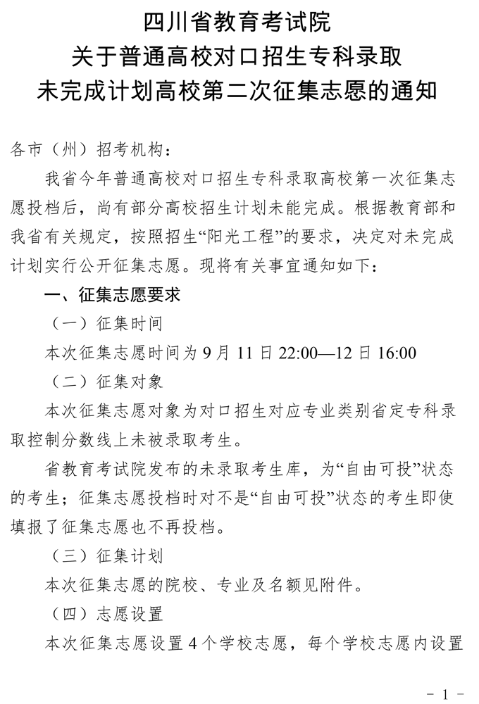 关于普通高校对口招生专科录取未完成计划高校第二次征集志愿的通知