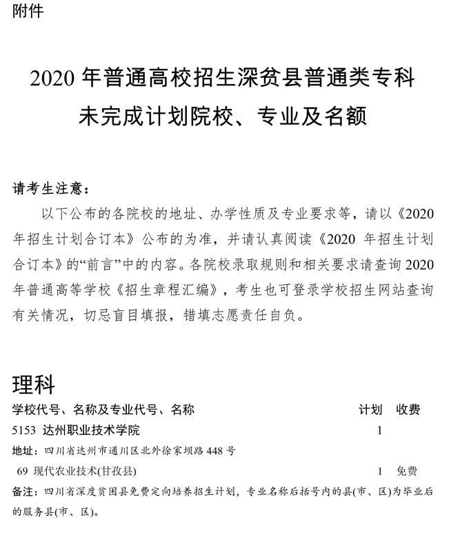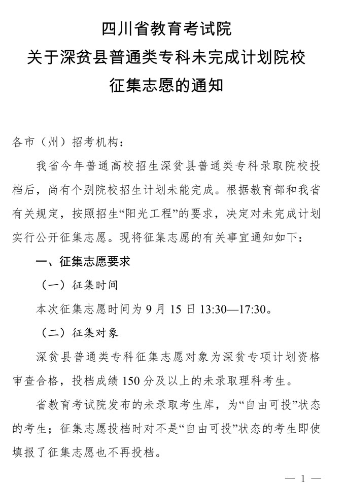 关于深贫县普通类专科未完成计划院校征集志愿的通知