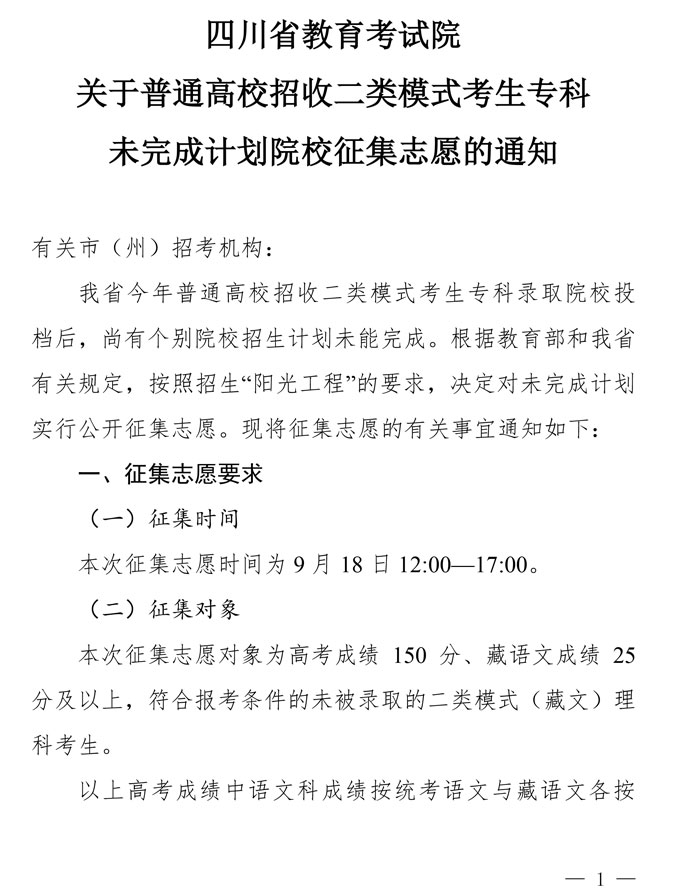 关于普通高校招收二类模式考生专科未完成计划院校征集志愿的通知