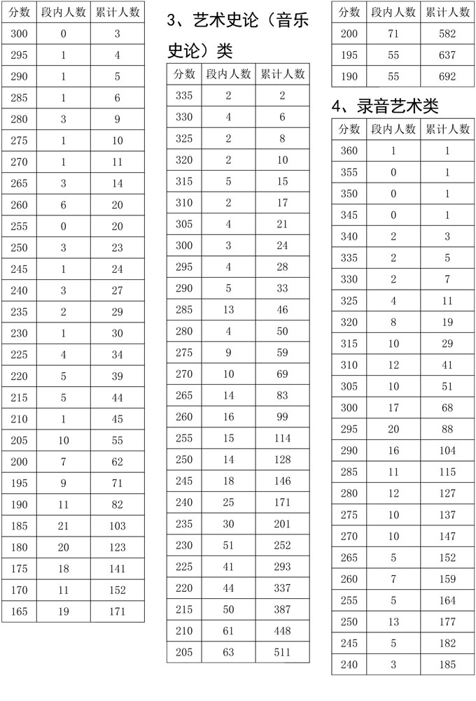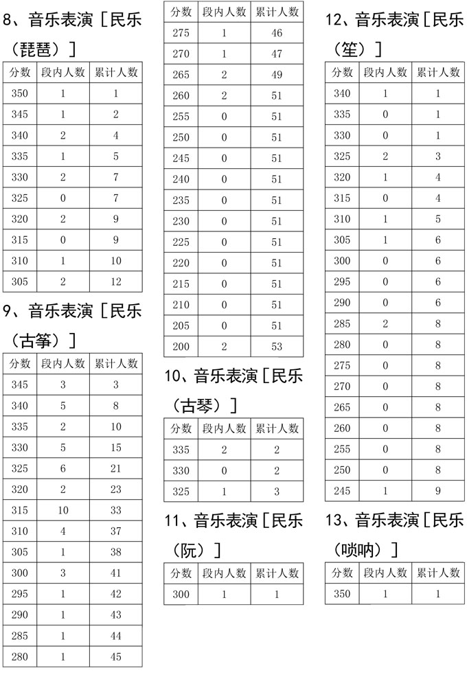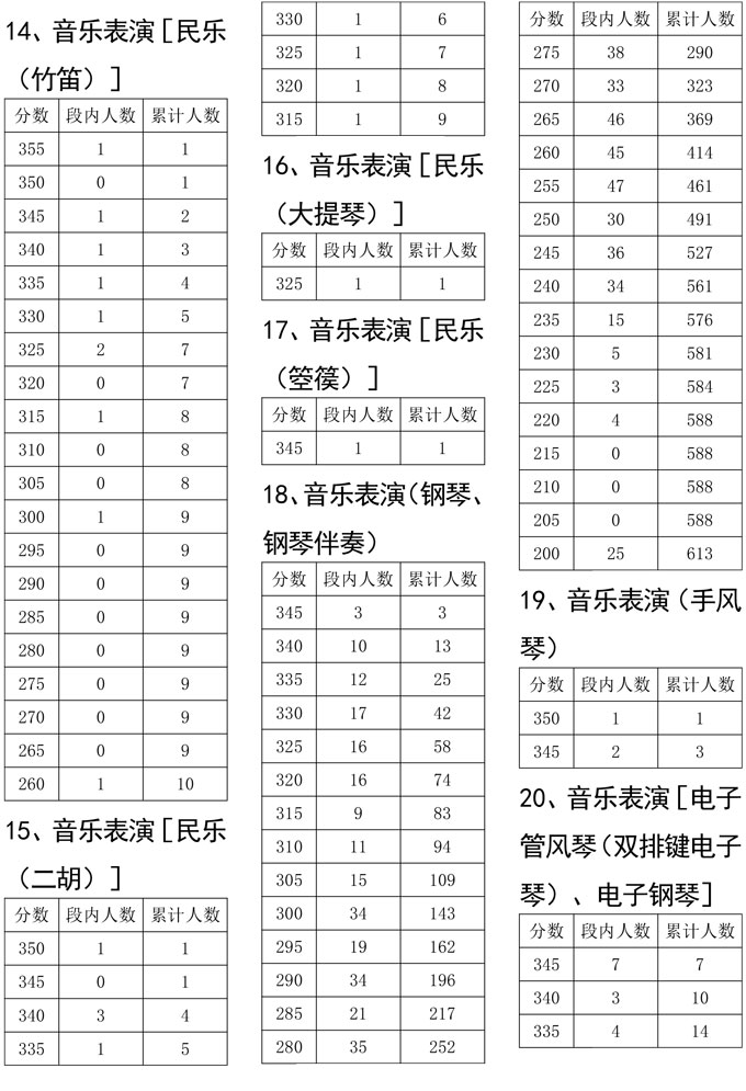 我省2021年度普通高校招生音乐类专业统考于2021年1月进行,考生参加校考资格线已经省招考委划定。为便于考生和组织专业校考的招生学校了解专业统考成绩分布情况,现把专业统考成绩达到校考资格线考生的专业总分五分段统计表进行公布,供考生和招生学校查阅。