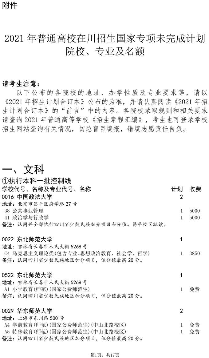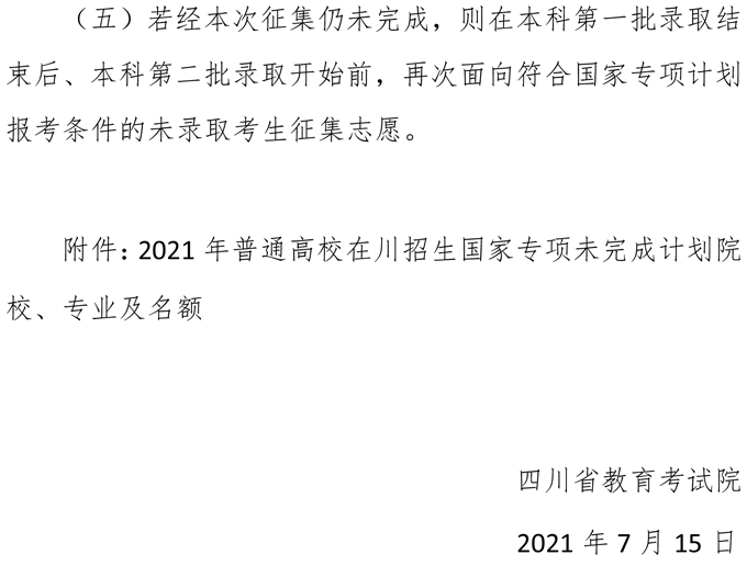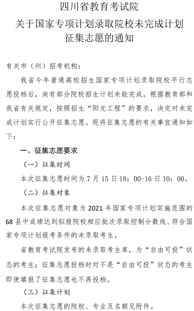 关于国家专项计划录取院校未完成计划征集志愿的通知