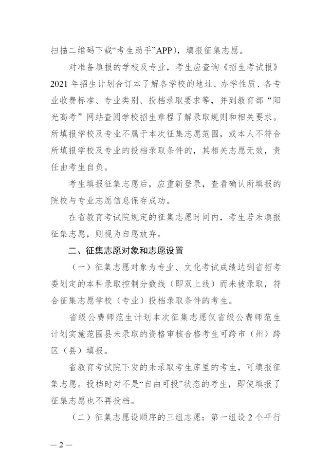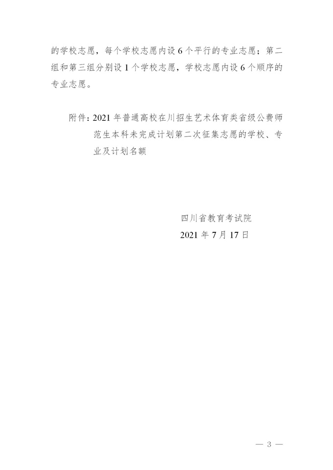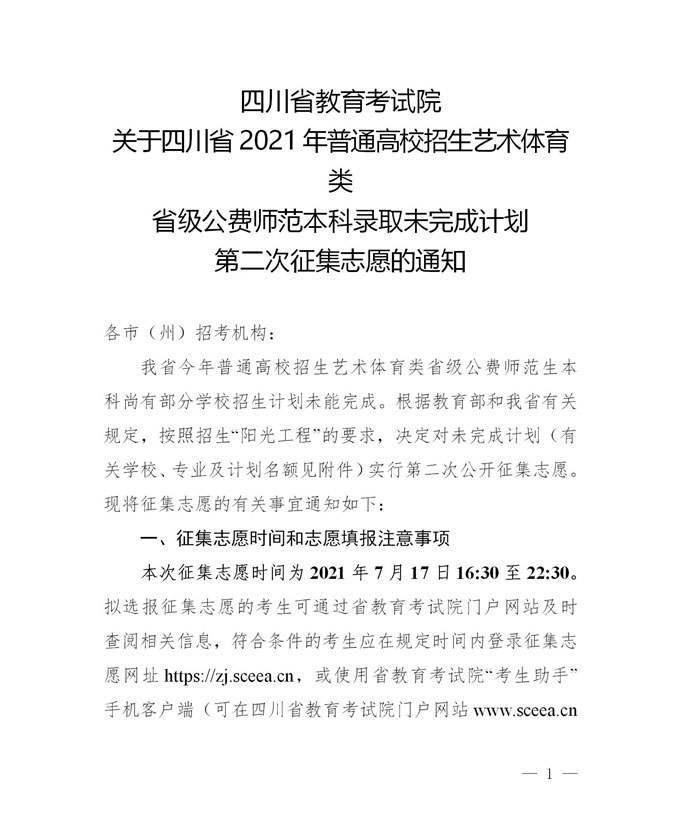 关于四川省2021年普通高校招生艺术体育类省级公费师范本科录取未完成计划第二次征集志愿的通知
