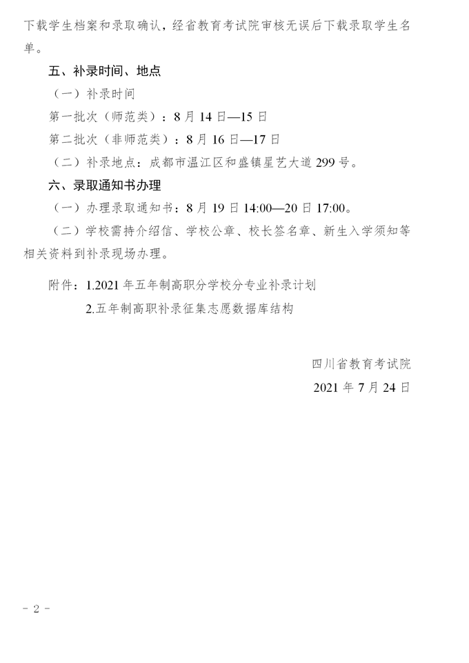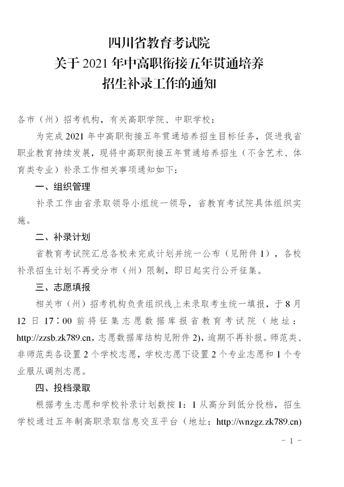 关于2021年中高职衔接五年贯通培养招生补录工作的通知