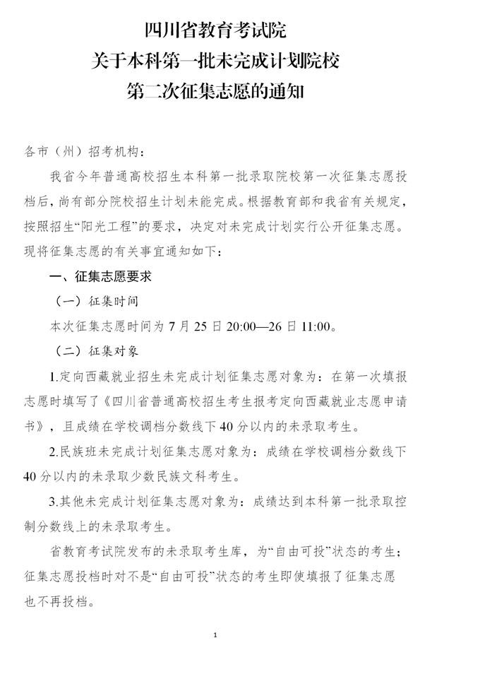 关于本科第一批未完成计划院校第二次征集志愿的通知