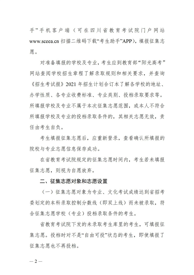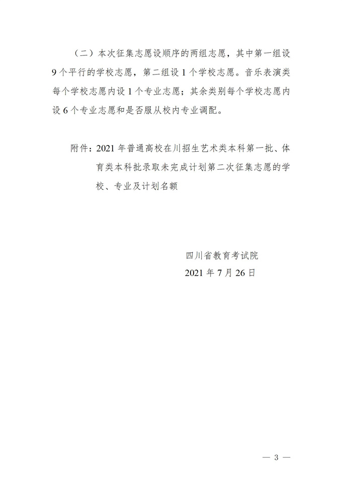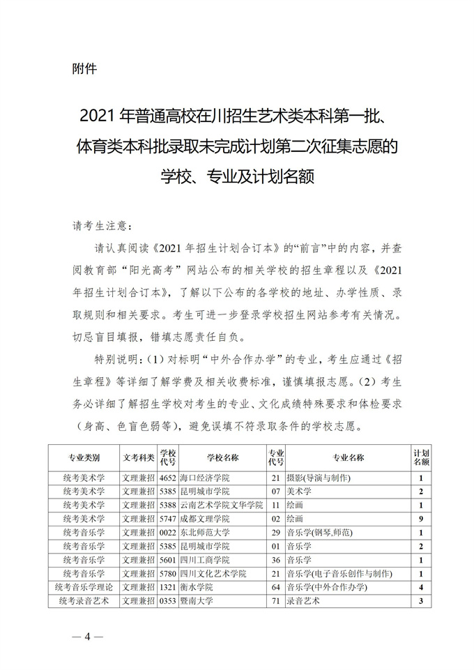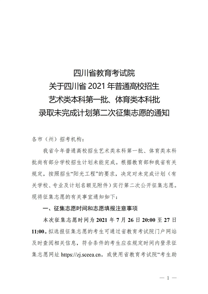 关于四川省2021年普通高校招生艺术类本科第一批、体育类本科批录取未完成计划第二次征集志愿的通知