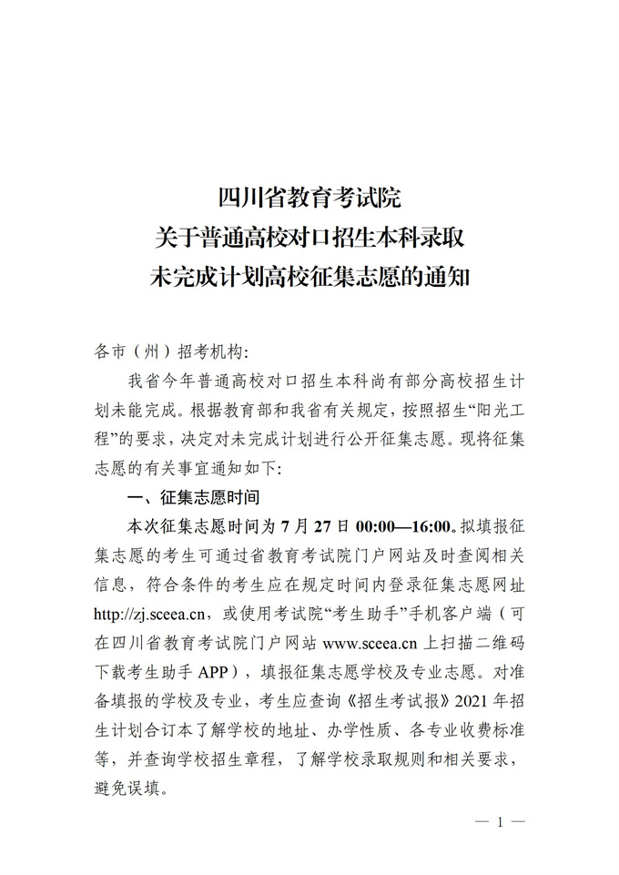 关于普通高校对口招生本科录取未完成计划高校征集志愿的通知