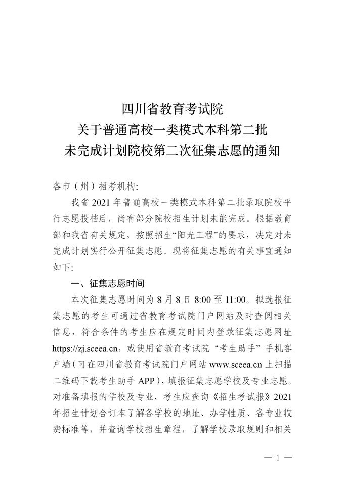 关于普通高校一类模式本科第二批未完成计划院校第二次征集志愿的通知