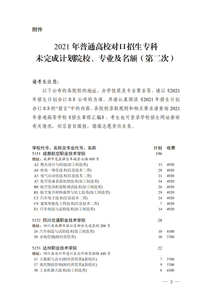 关于普通高校对口招生专科录取未完成计划院校第二次征集志愿的通知