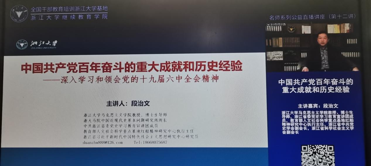 会议采取个人自学、领导领学、专家专题讲座和交流发言相结合的方式进行。18日上午,全院党员干部在线收看了由浙江大学马克思主义学院博士生导师段治文教授主讲的《中国共产党百年奋斗的重大成就和历史经验——深入学习和领会党的十九届六中全会精神》专题讲座。