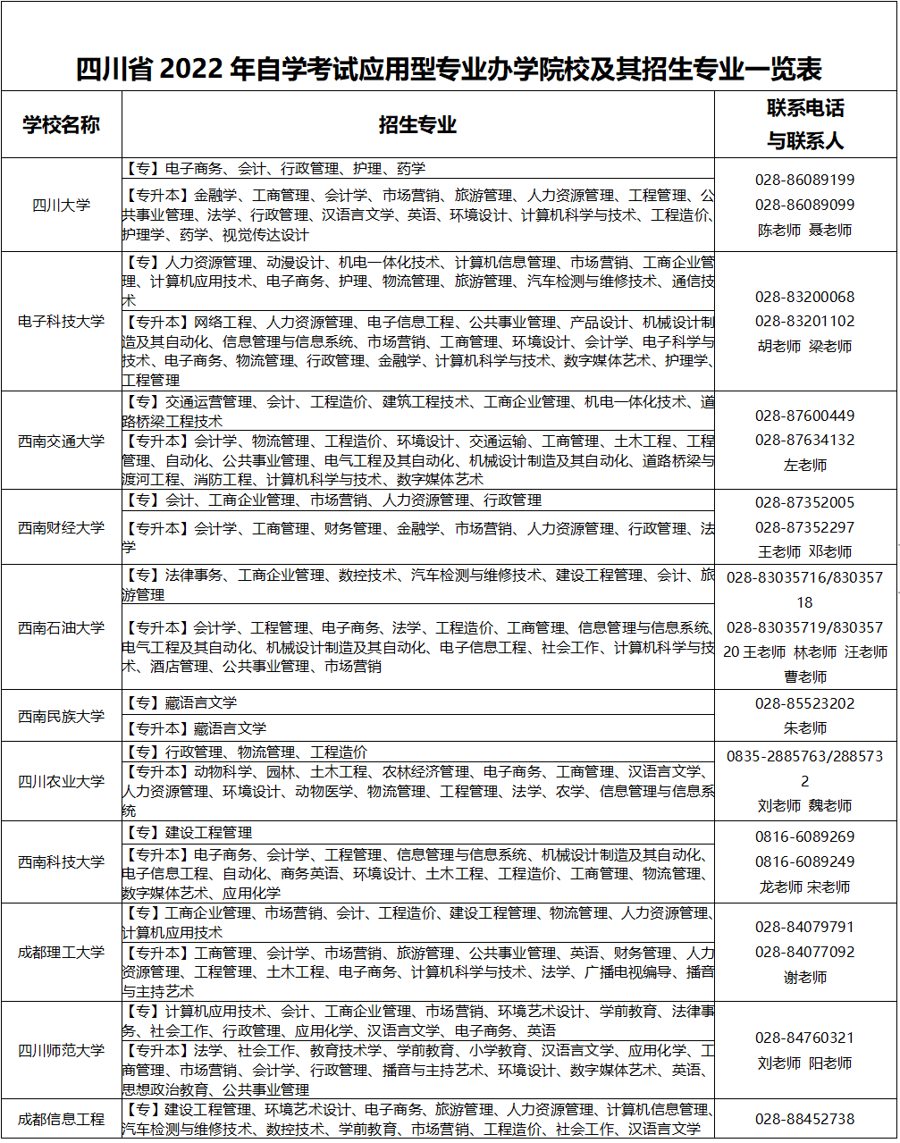 自学考试是我国高等教育的重要组成部分,是个人自学、社会助学和国家考试相结合的高等教育形式。为促进自学考试持续健康发展,省招考委、教育厅同意四川大学等60所高等学校为我省2022年高等教育自学考试应用型专业的主考学校,并开展自学考试助学工作,现将有关高等学校、主考专业及相关情况公告如下: