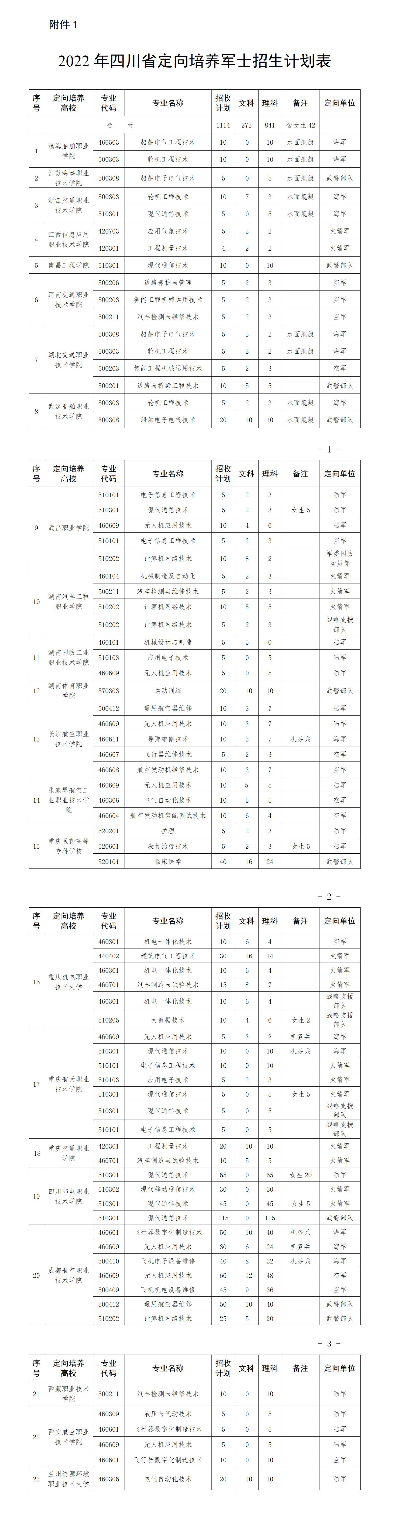 附件:1. 2022年四川省定向培养军士招生计划表(下载)