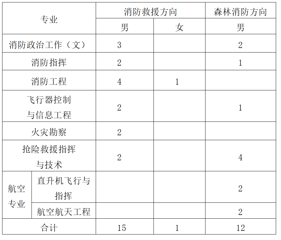 中国消防救援学院计划在四川省招收普通高中毕业生28名,其中消防救援方向16人(含1名女生),森林消防方向12人(含4名航空专业)。消防政治工作专业招录文史类考生,其他专业招录理工类考生。