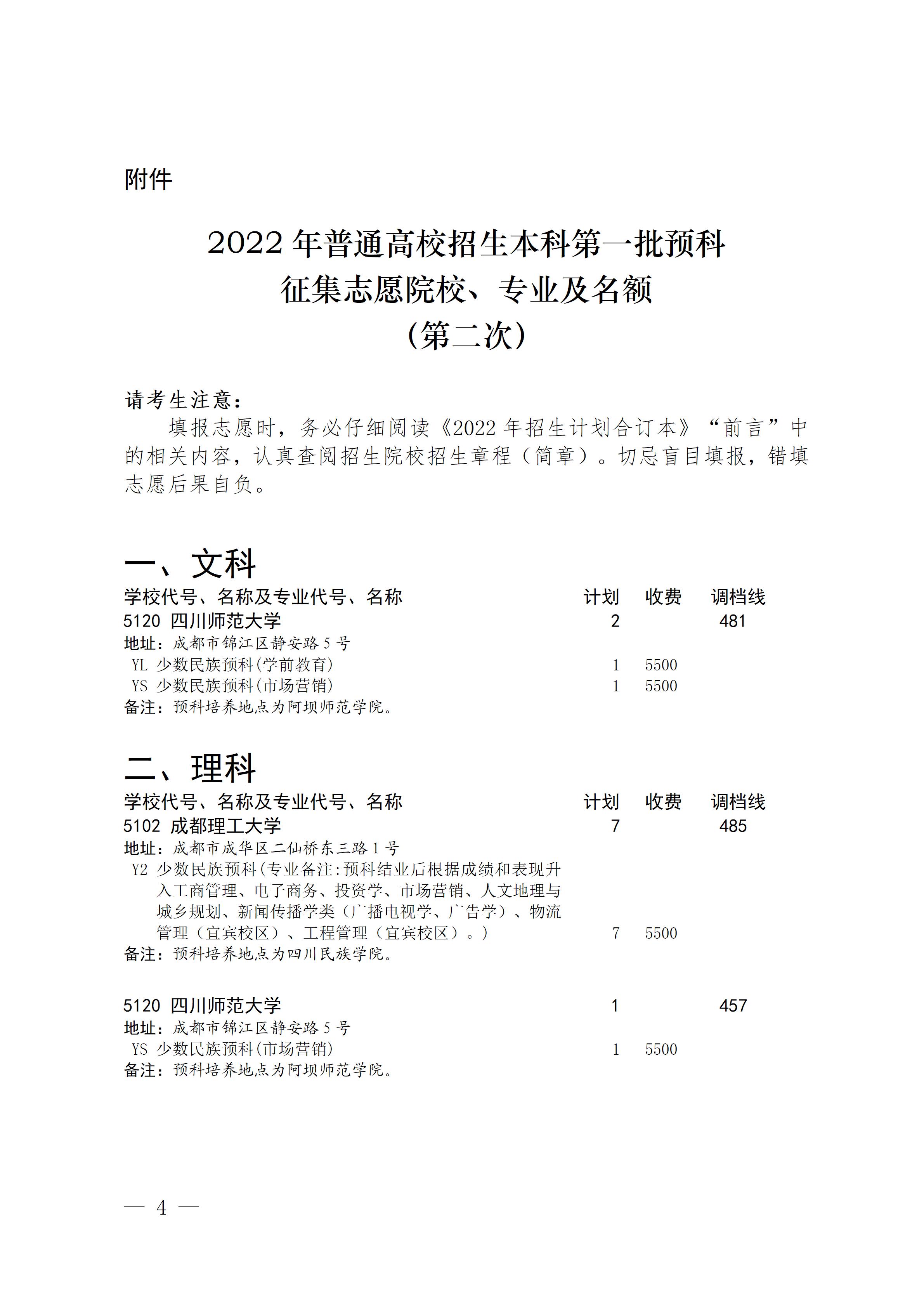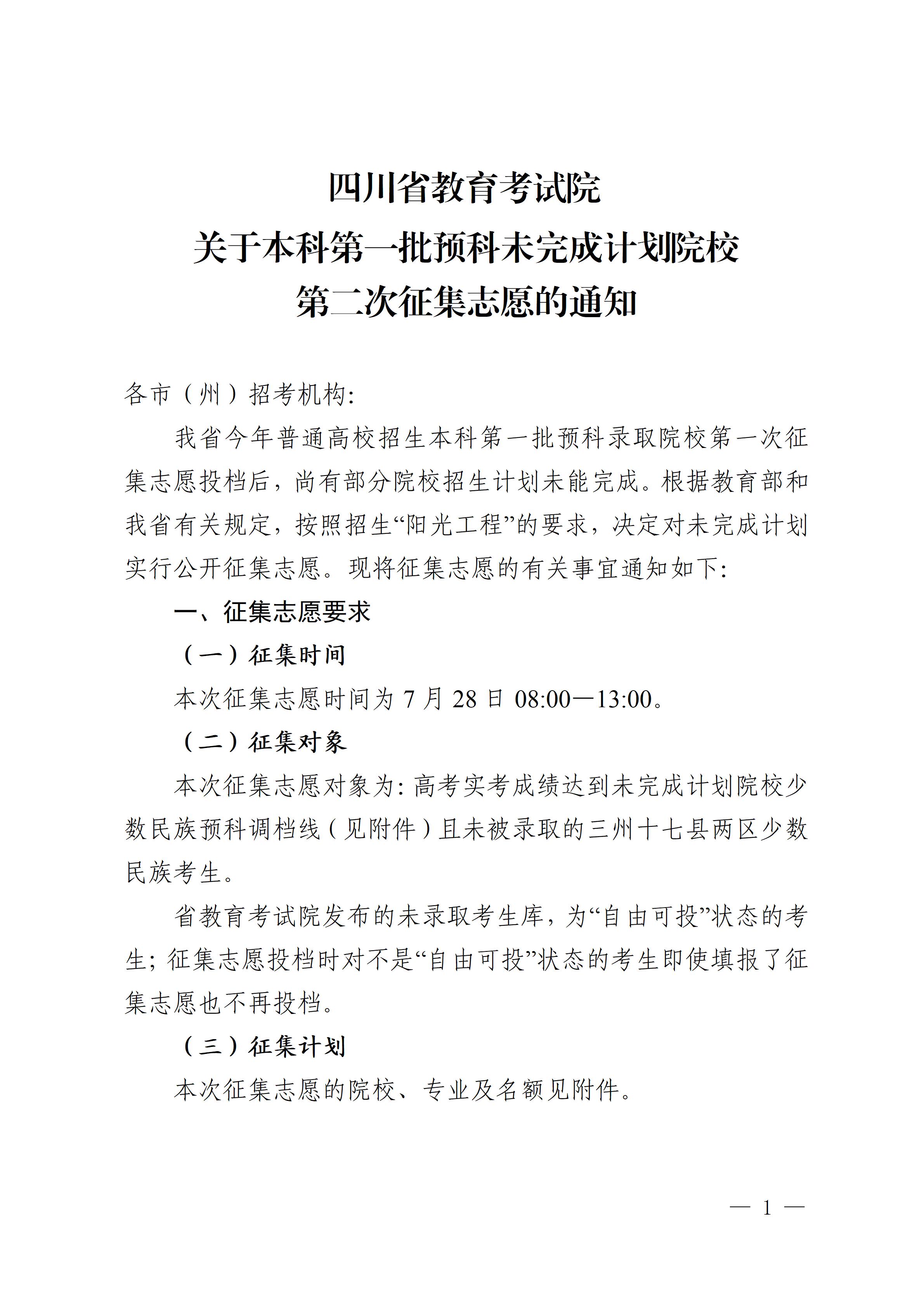 关于本科第一批预科未完成计划院校第二次征集志愿的通知