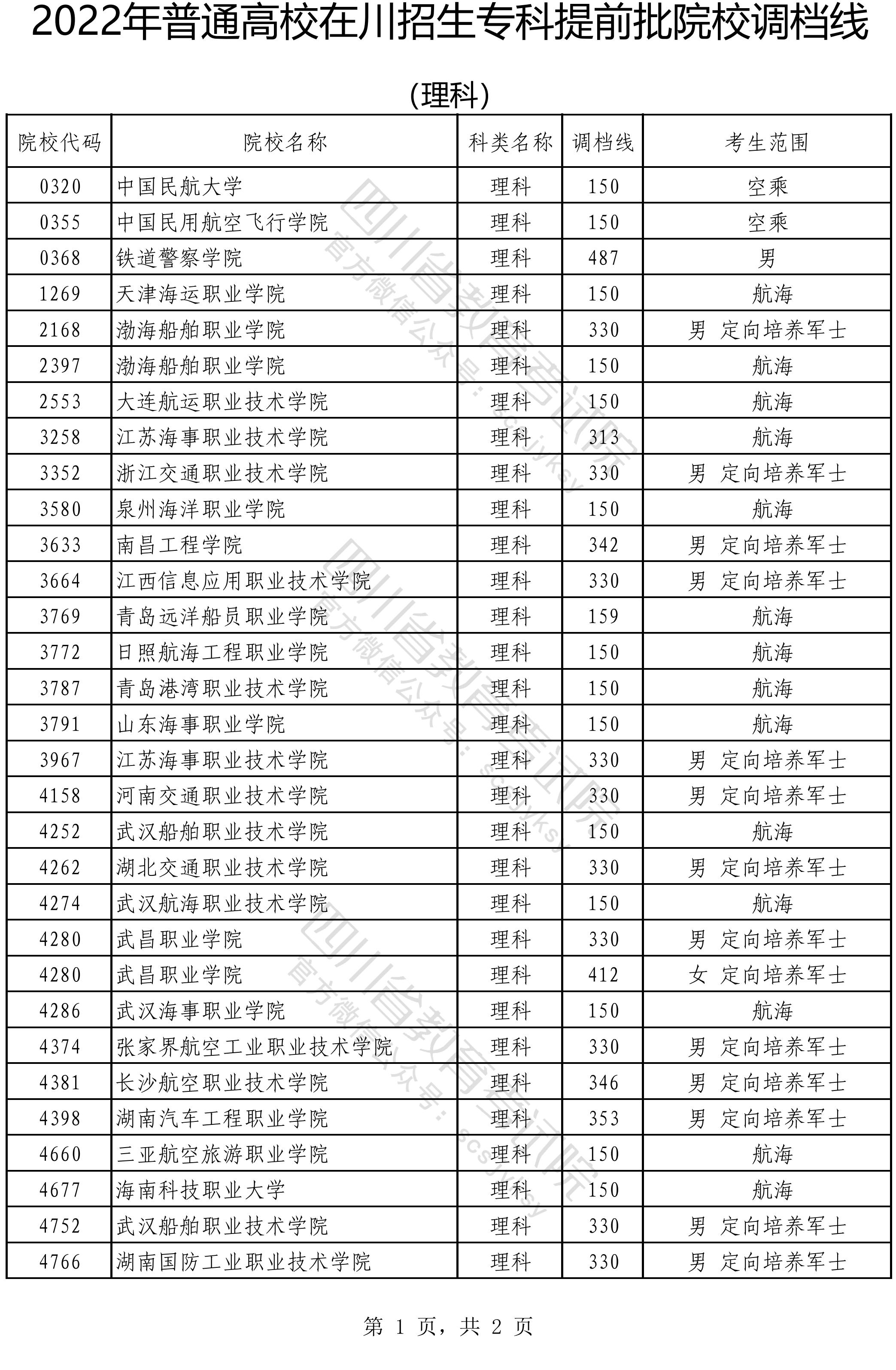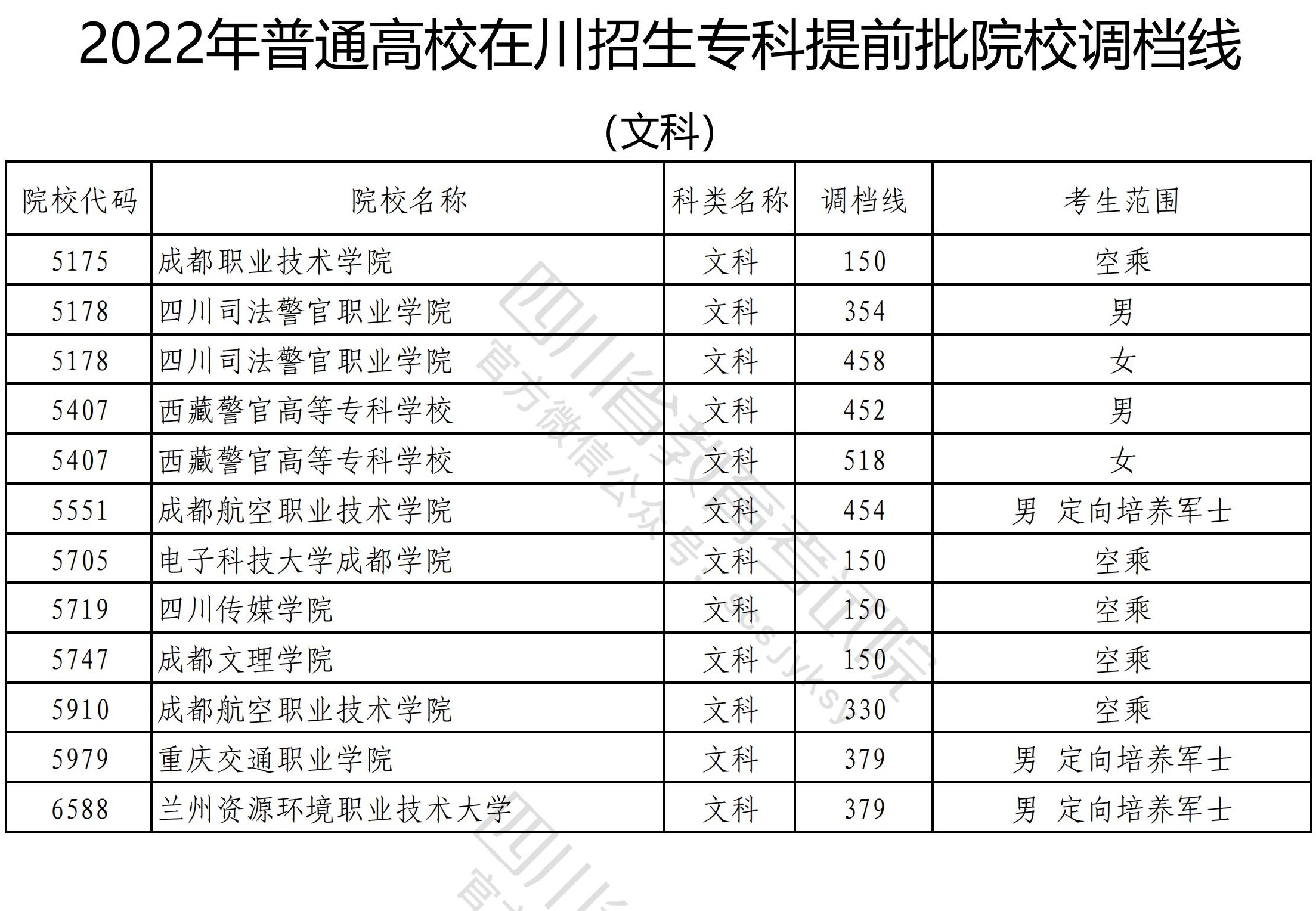 2022年普通高校在川招生专科提前批院校调档线