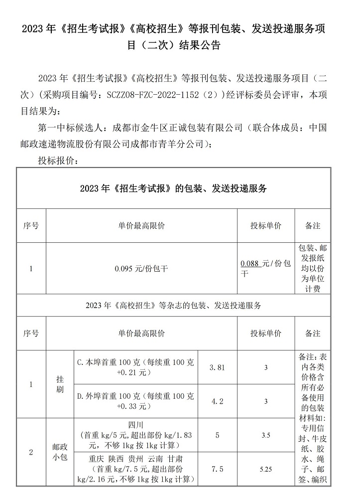 2023年《招生考试报》《高校招生》等报刊包装、发送投递服务项目(二次)结果公告
