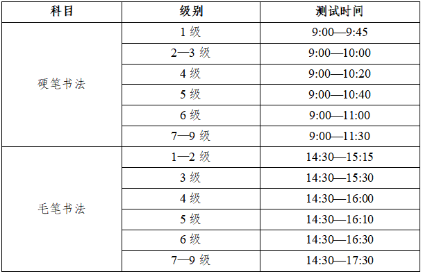 2023年4月22日(星期六),硬笔书法和毛笔书法各级别具体测试时间如下: