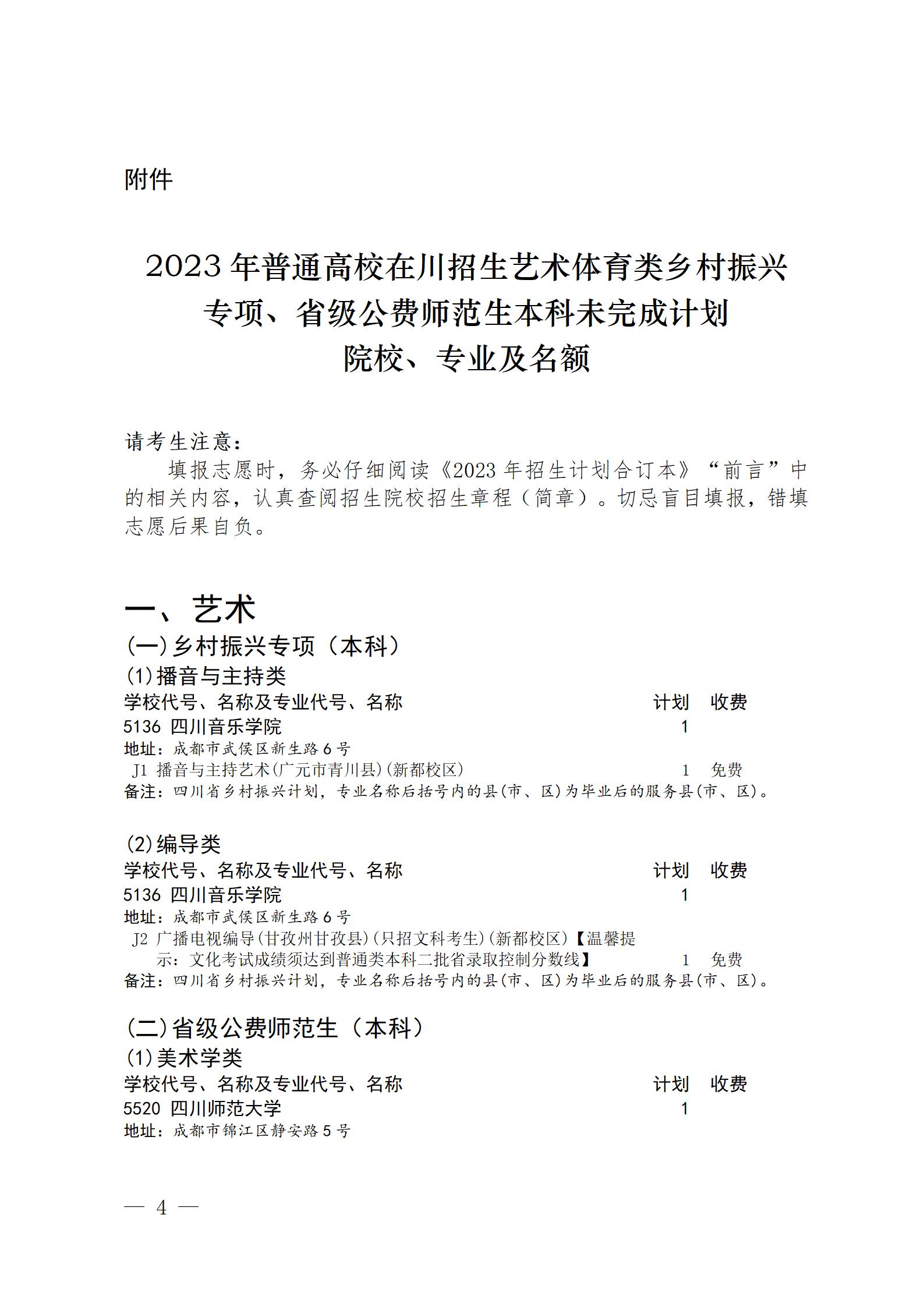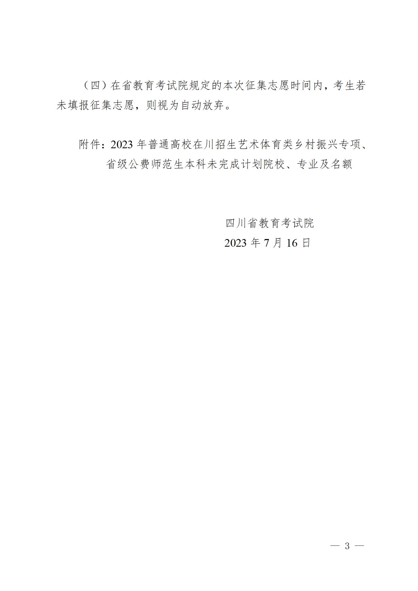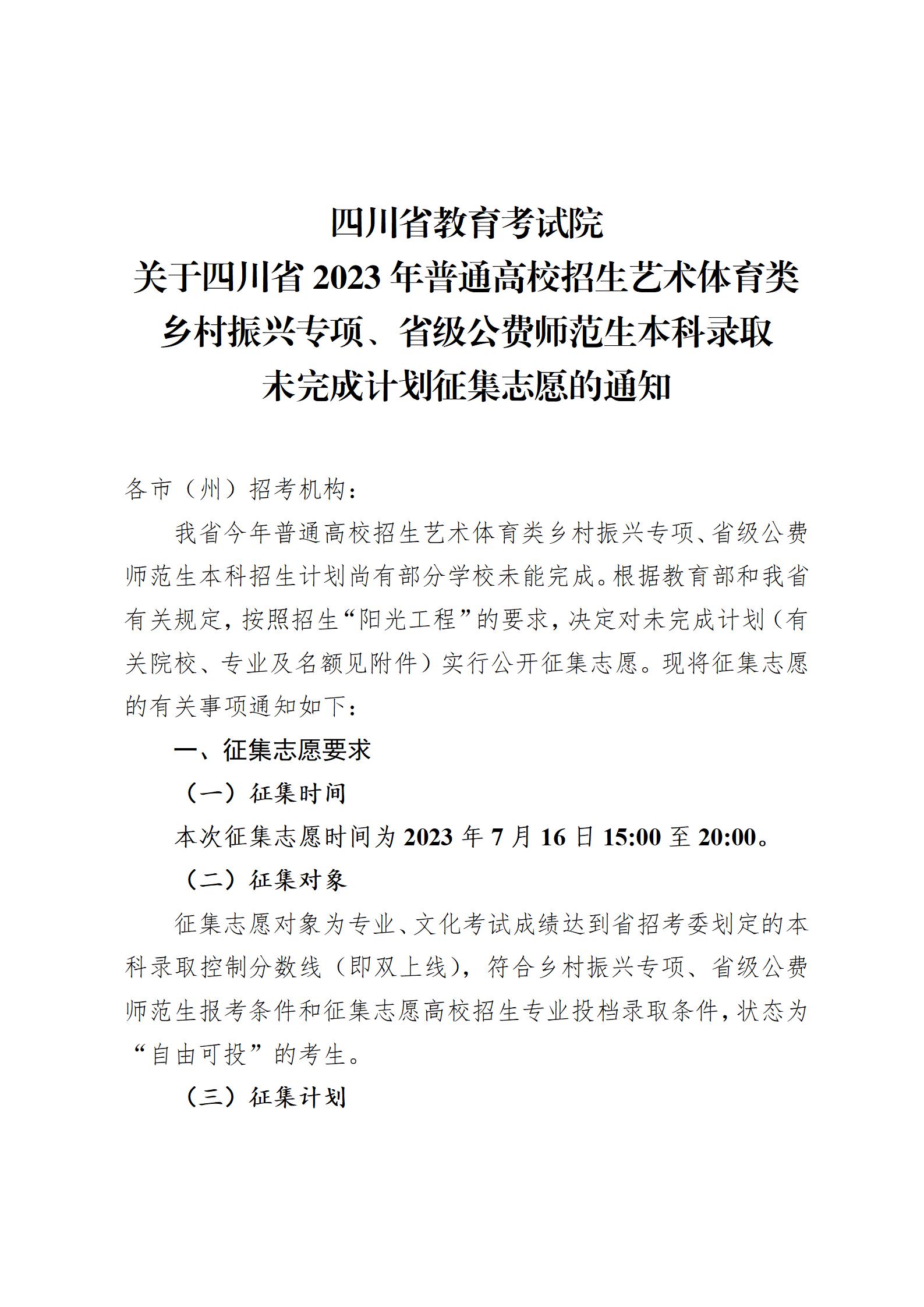 关于四川省2023年普通高校招生艺术体育类 乡村振兴专项、省级公费师范生本科录取 未完成计划征集志愿的通知