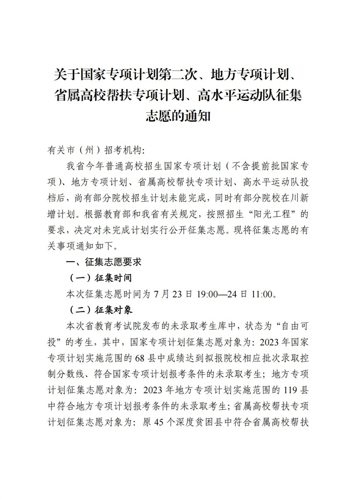 关于国家专项计划第二次、地方专项计划、省属高校帮扶专项计划、高水平运动队征集志愿的通知