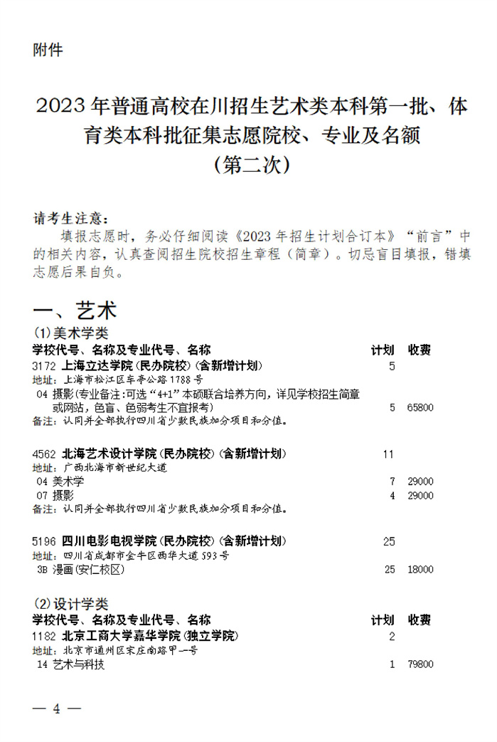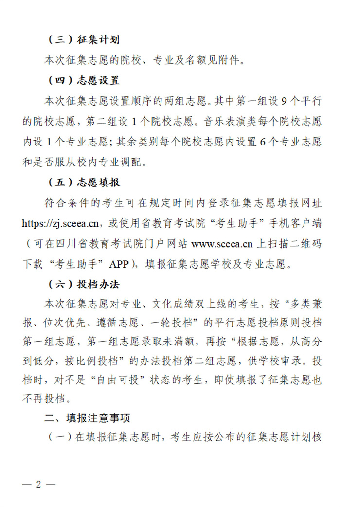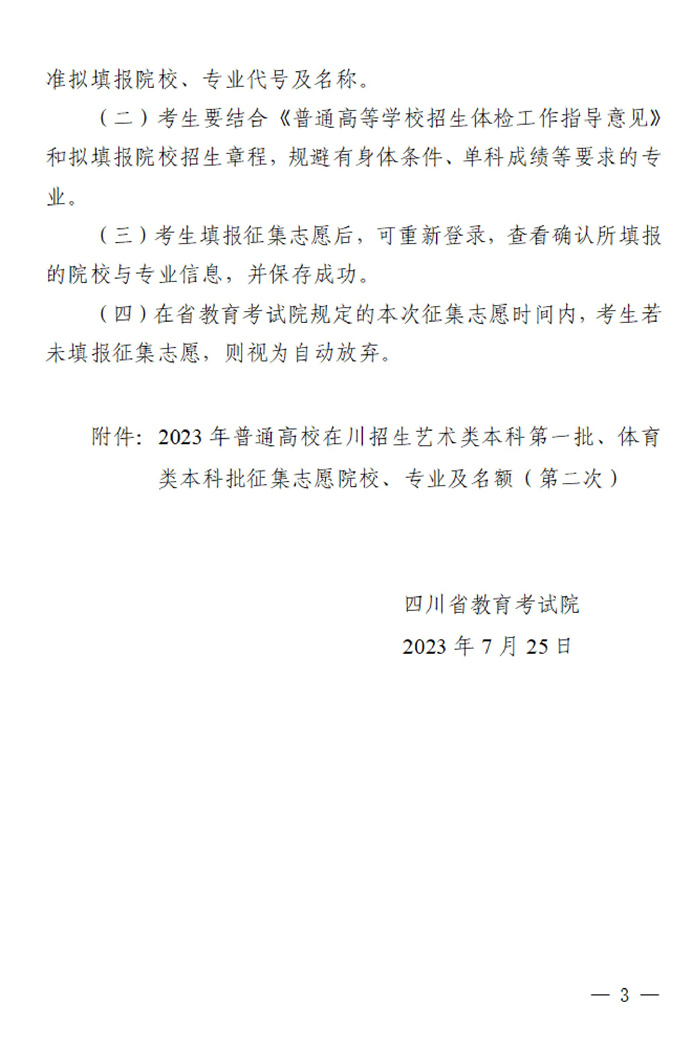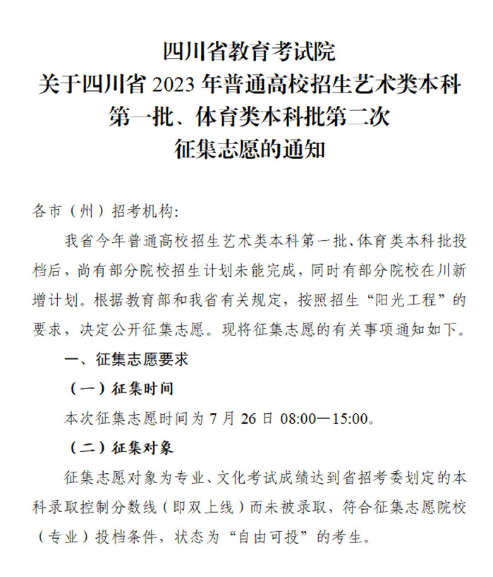 关于四川省2023年普通高校招生艺术类本科第一批、体育类本科批第二次征集志愿的通知